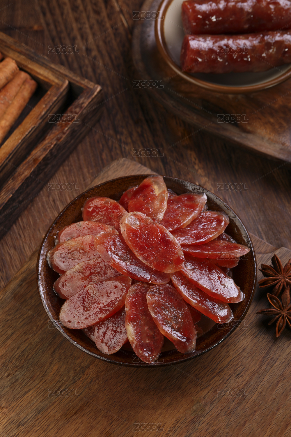 放在桌面的整根麻辣香肠和切片香肠