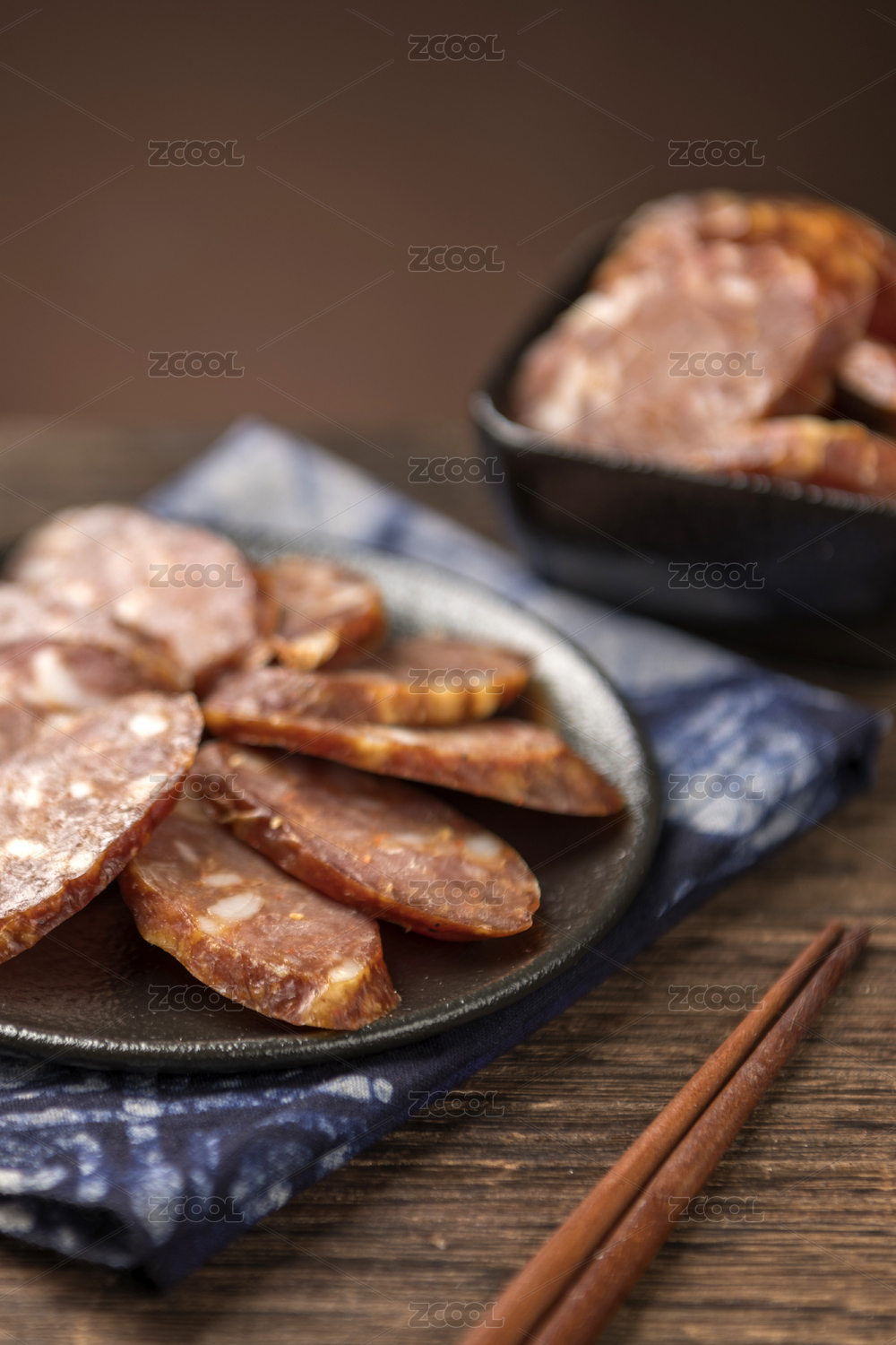 四川麻辣腊肠川味香肠特写深色调