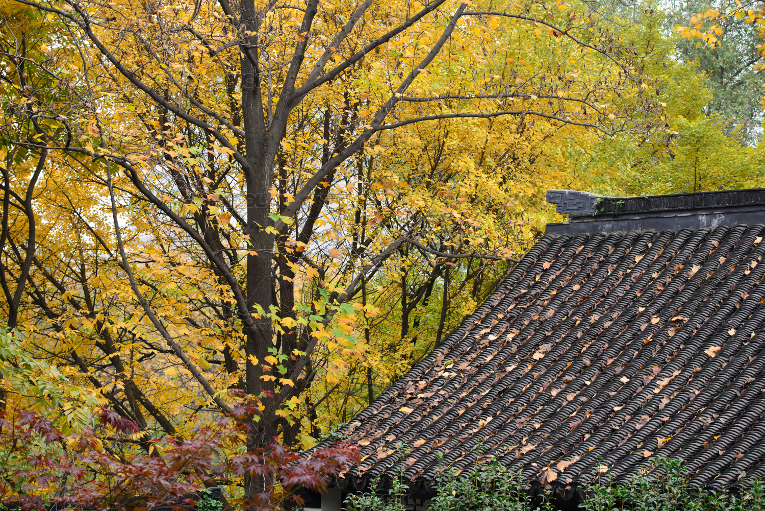 秋天季节瓦屋旁金黄色的银杏树叶子