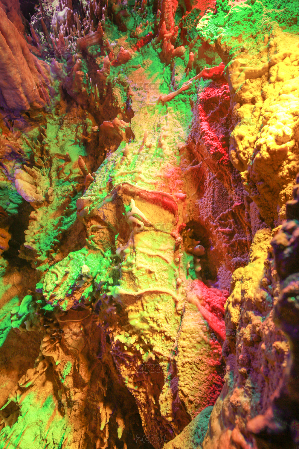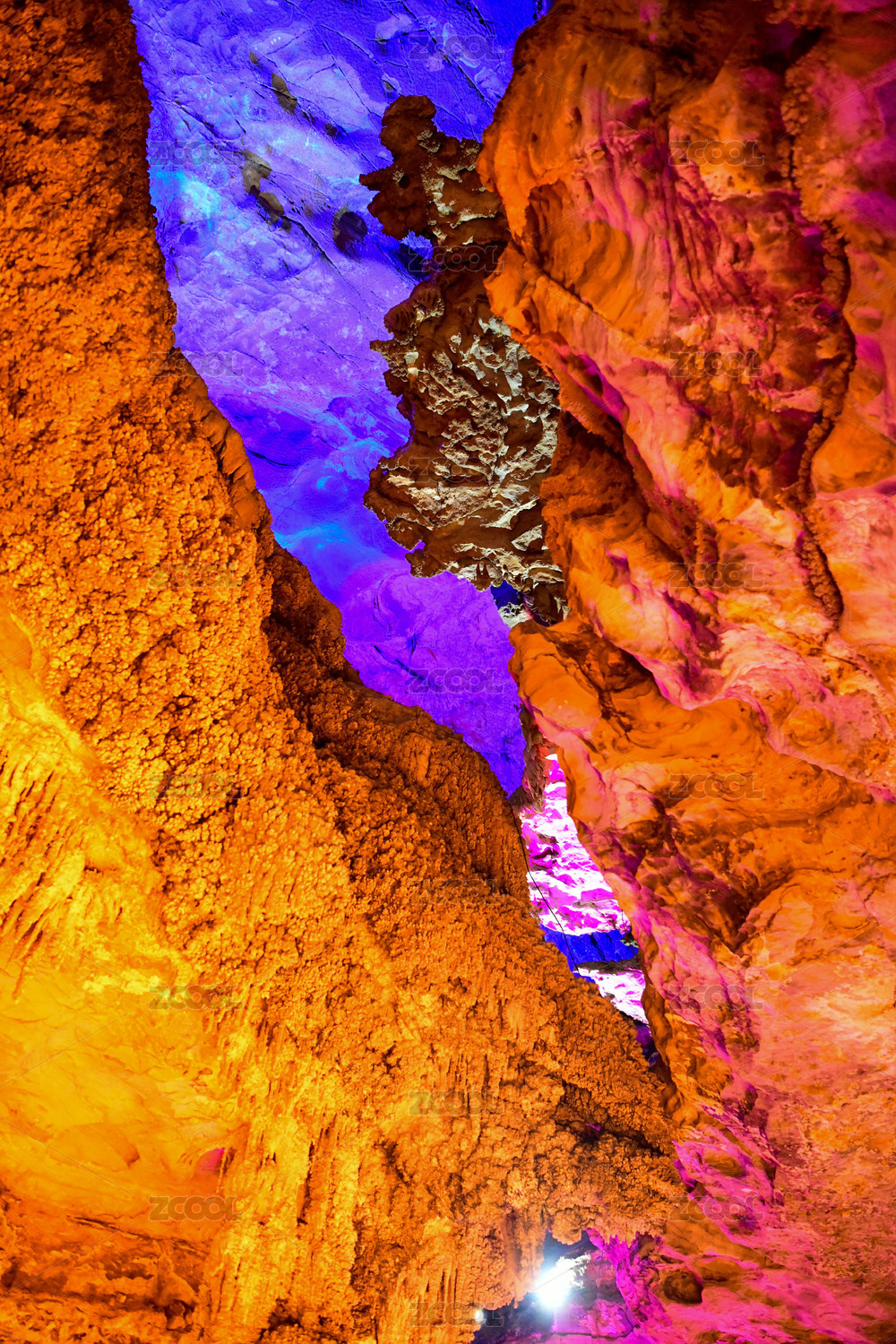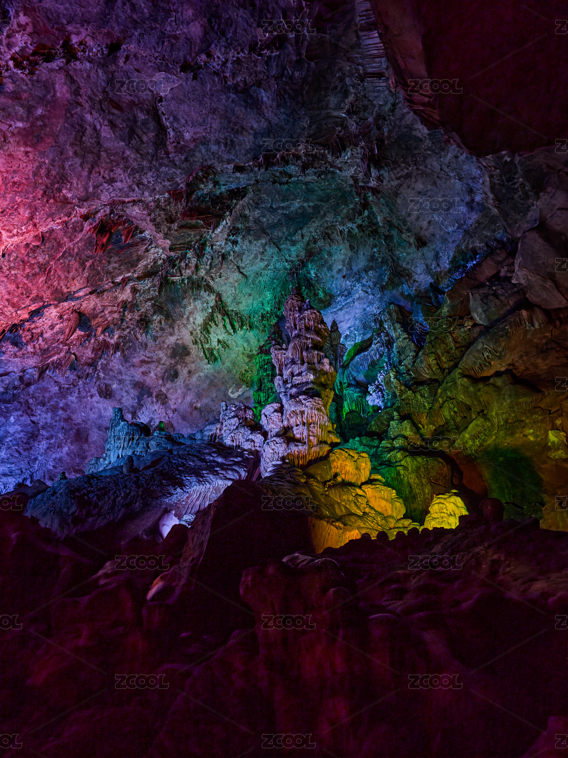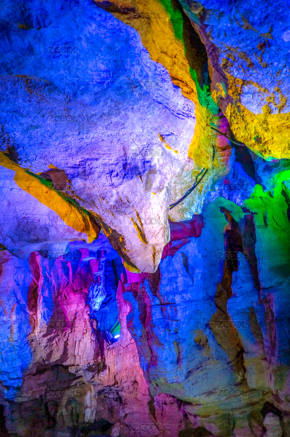桂林永福县乾龙天坑景区,灯光照射的钟乳石