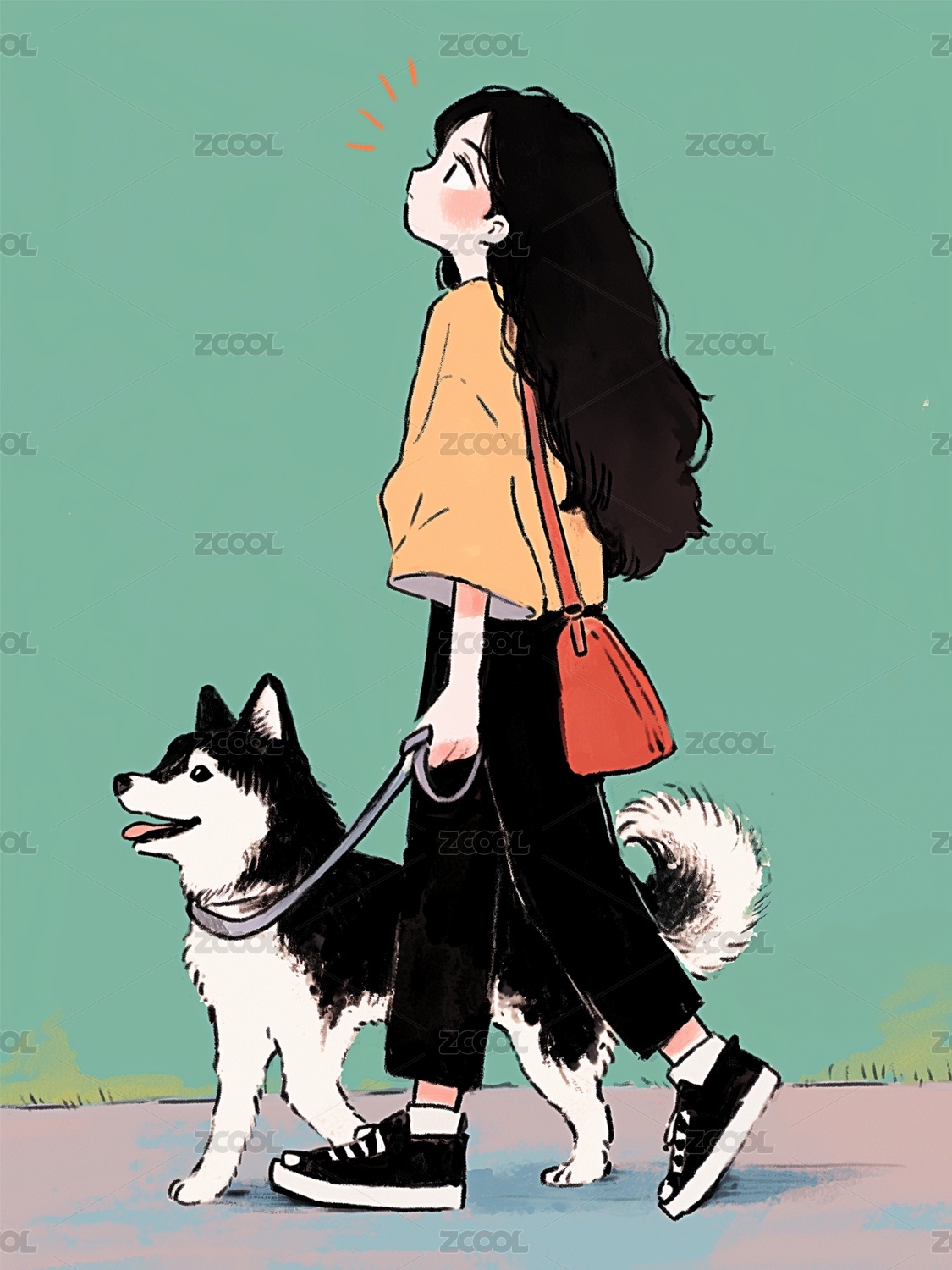 遛狗,女孩,插画,简笔画,可爱风,植物