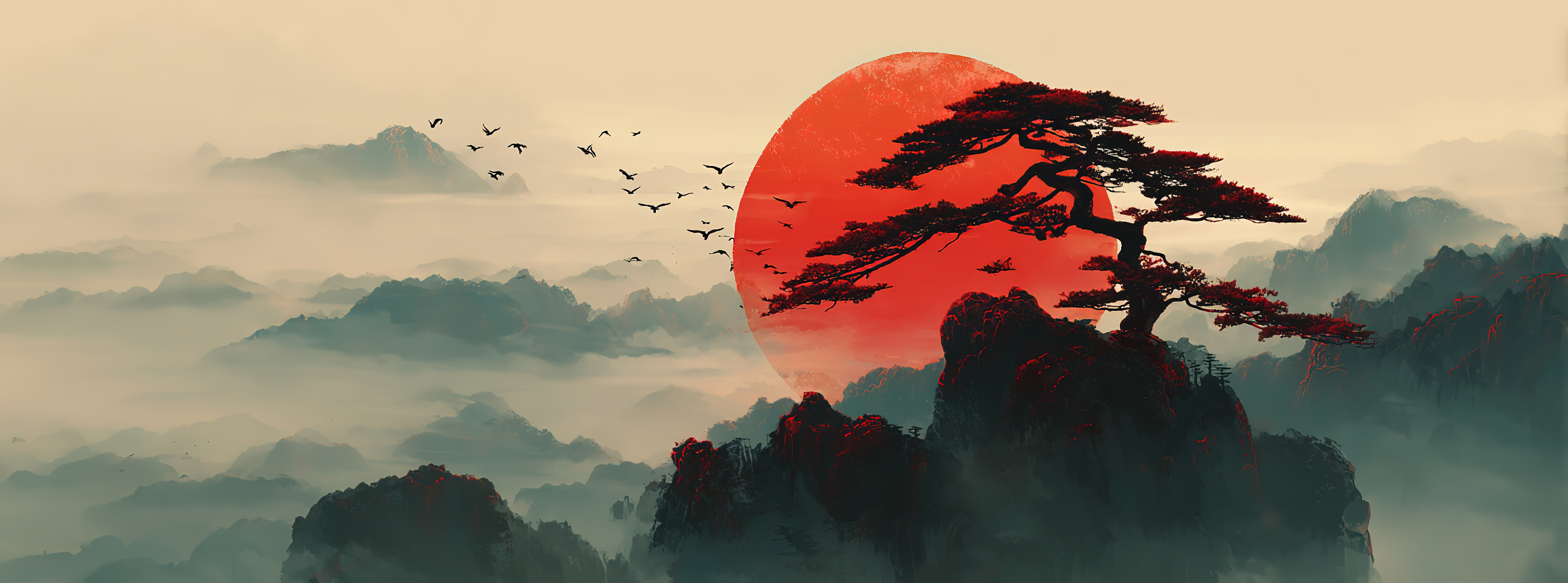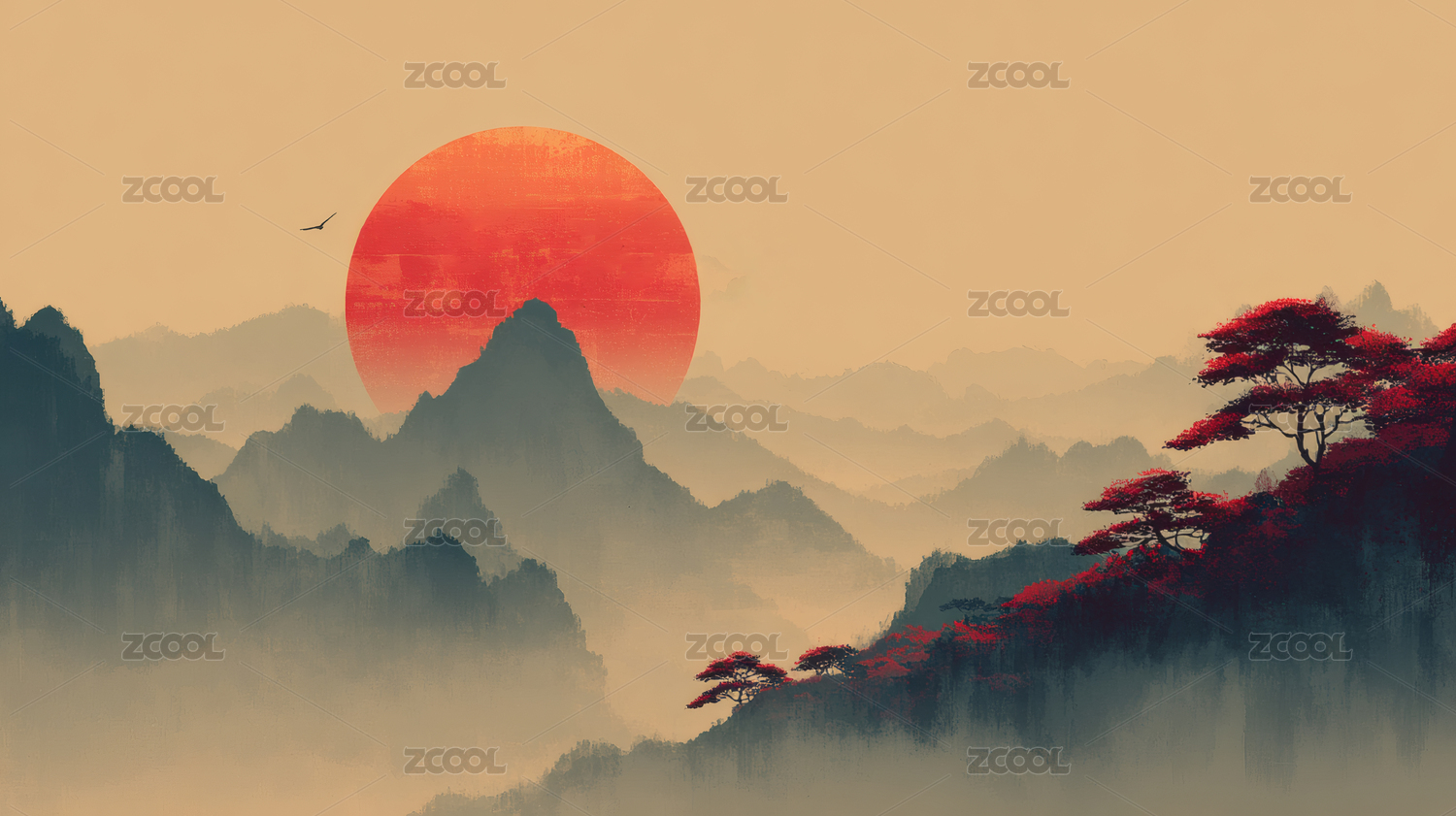 中式,山水,山脉,落日,夕阳,雾,松树,红色,蓝色,晚霞
