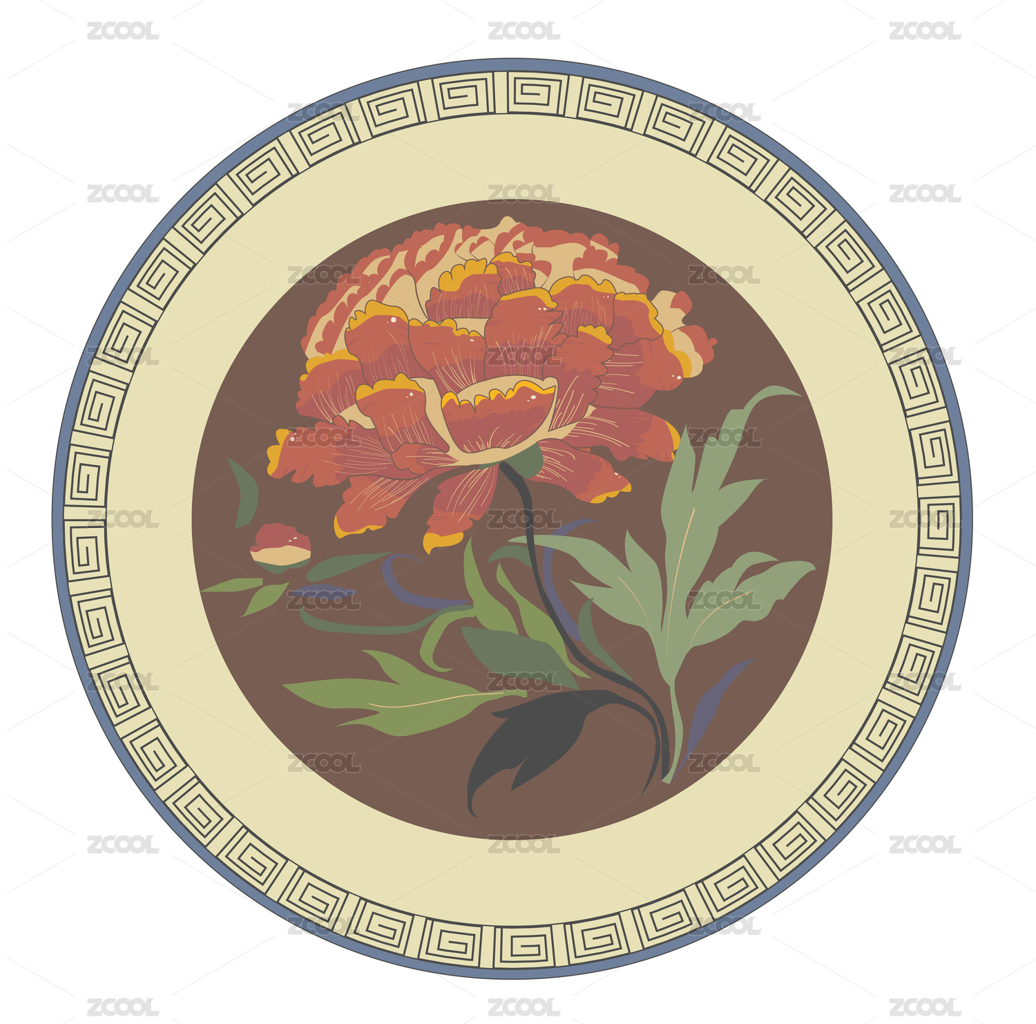 中国传统的彩色缠枝花纹圆形图案,白色背景
