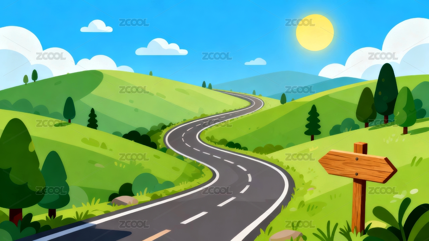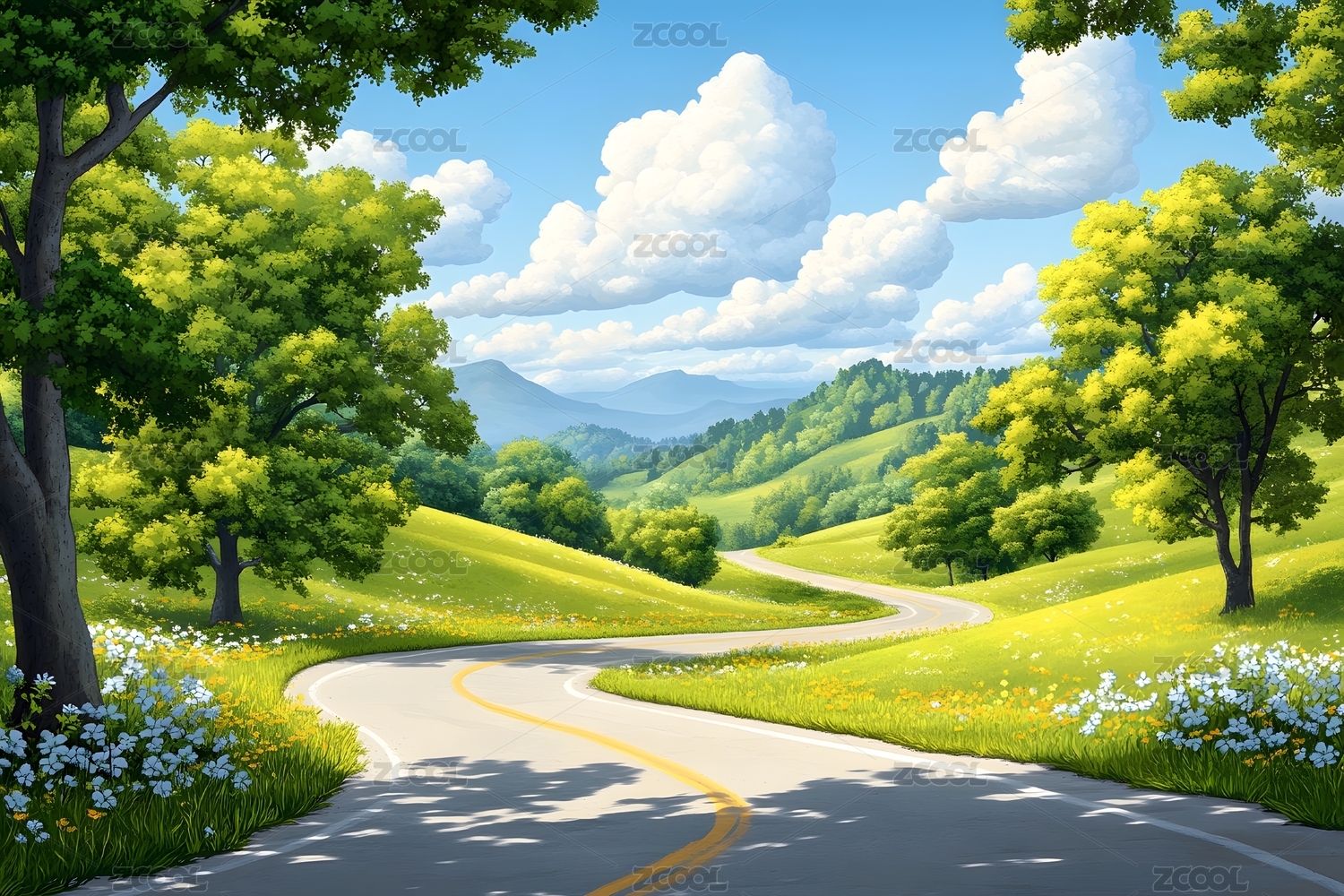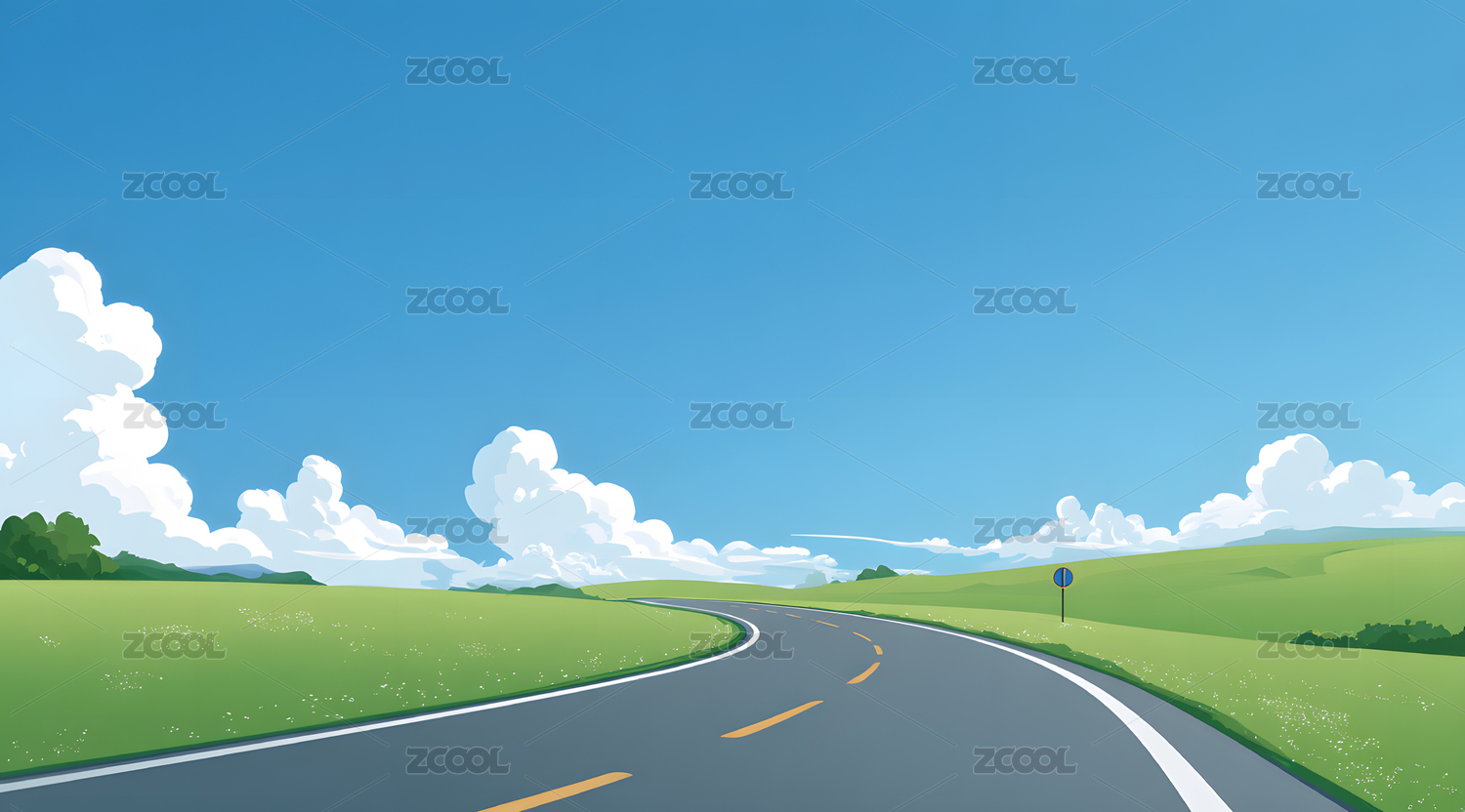 AIGC202404,马路,郊外,户外,草地,高山,蓝天,白云,延伸,广阔