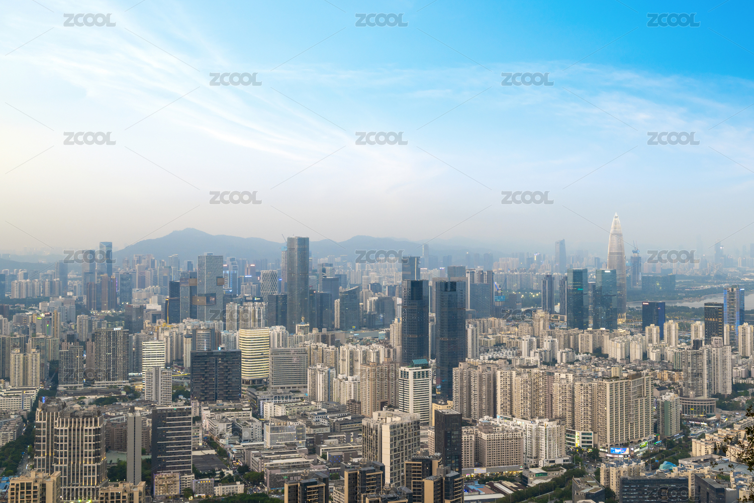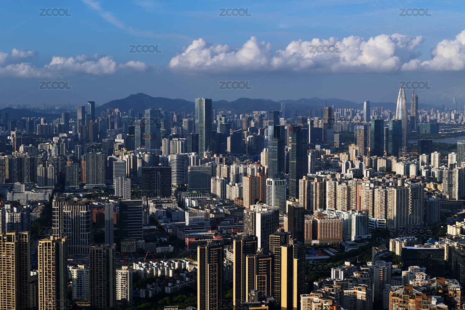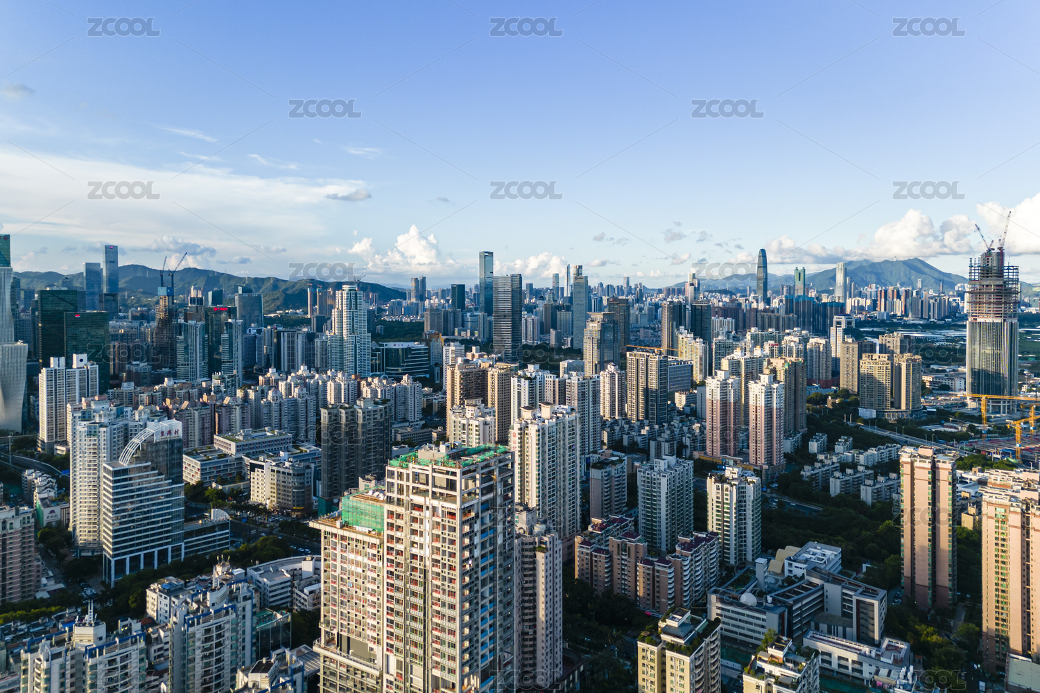 夏日黄昏鸟瞰中国广东省深圳城市天际线建筑群高楼大厦风光