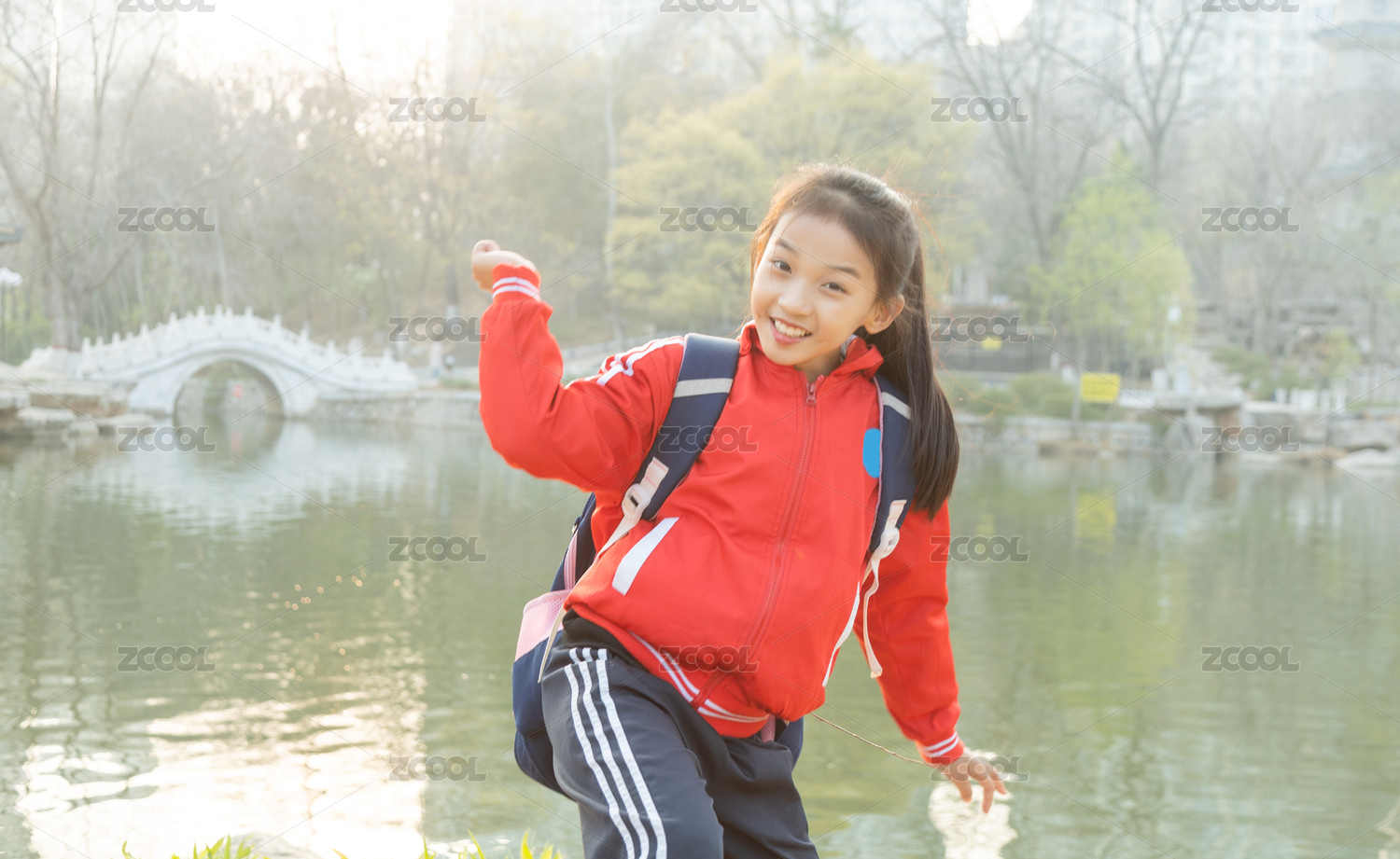 小学生,书包,女孩,公园,湖边,人工湖,校服,玩,水,树枝