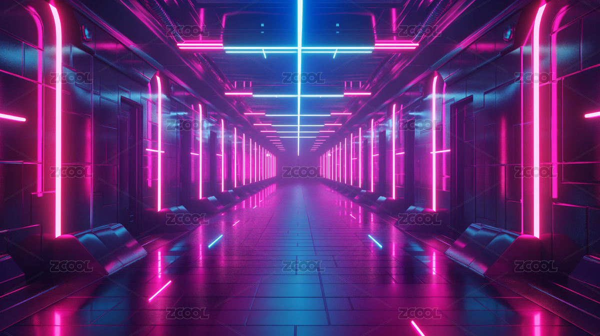 霓虹灯走廊的未来科技场景