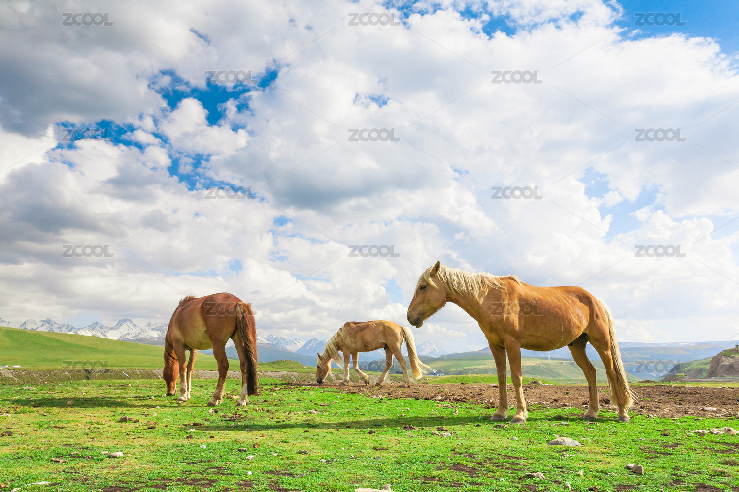 草原上三匹马悠闲吃草