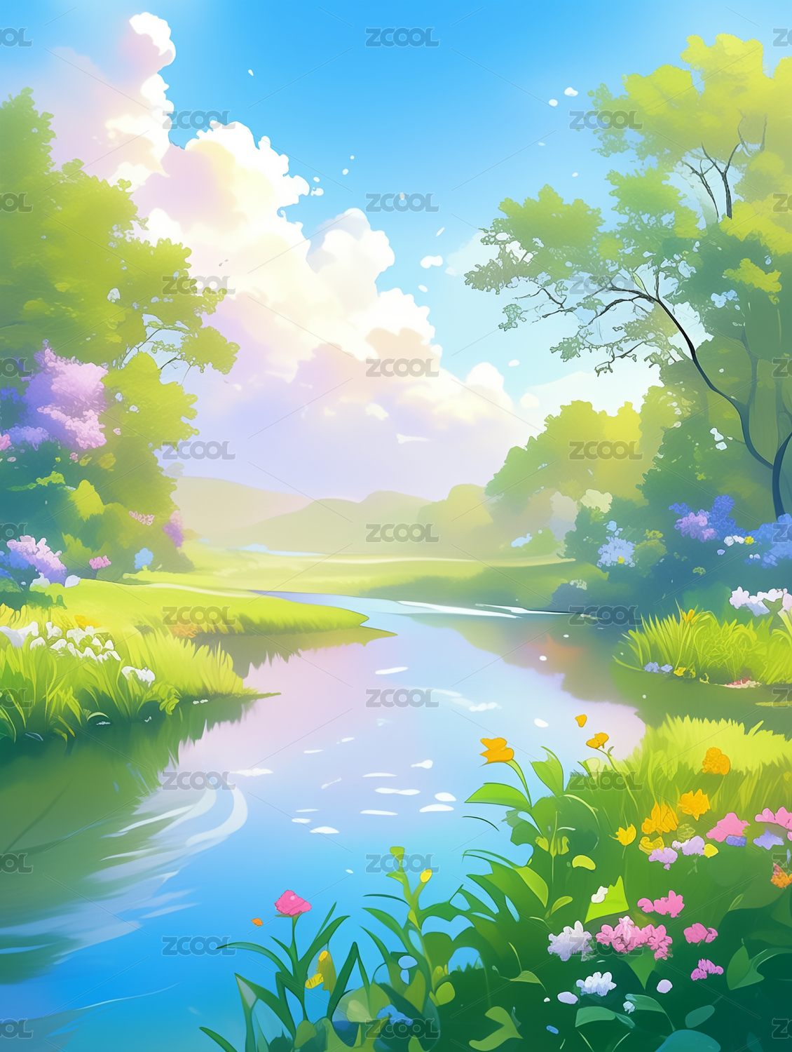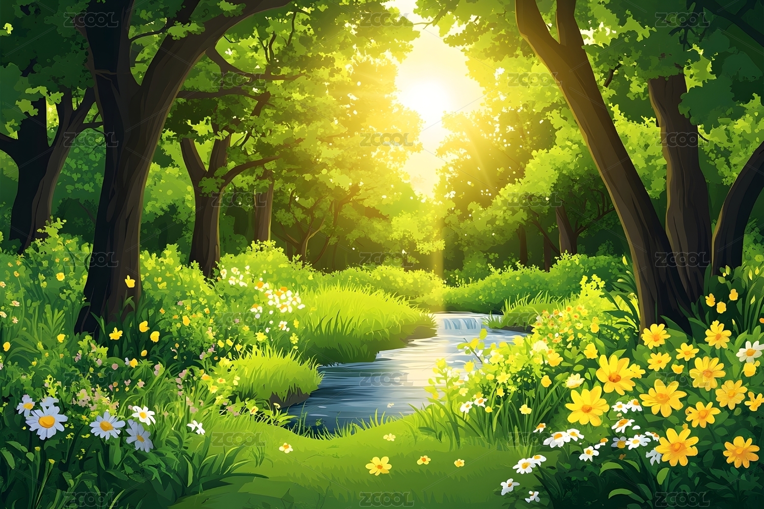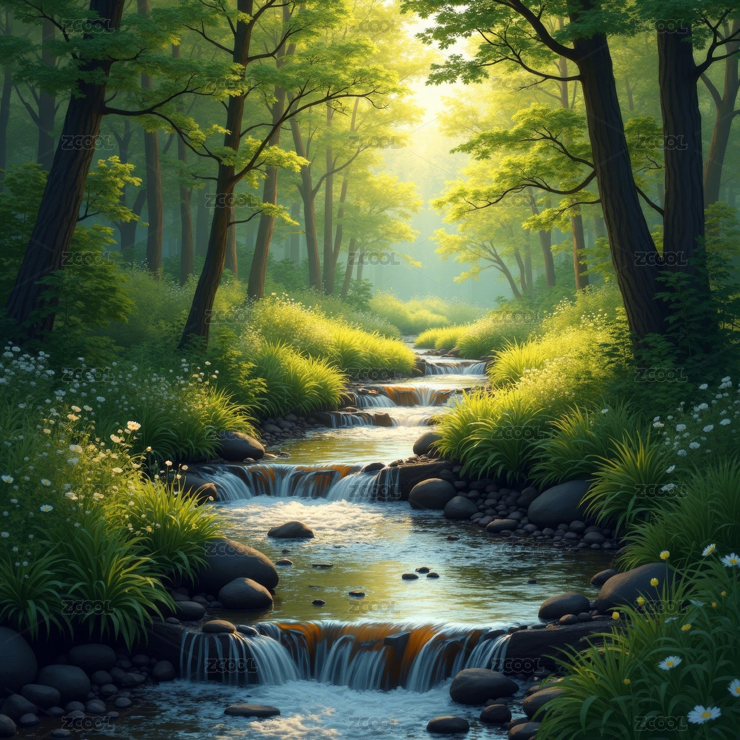 幽静绿色茂密森林中的清澈小溪插画绘画