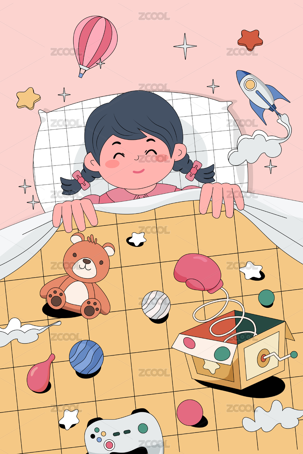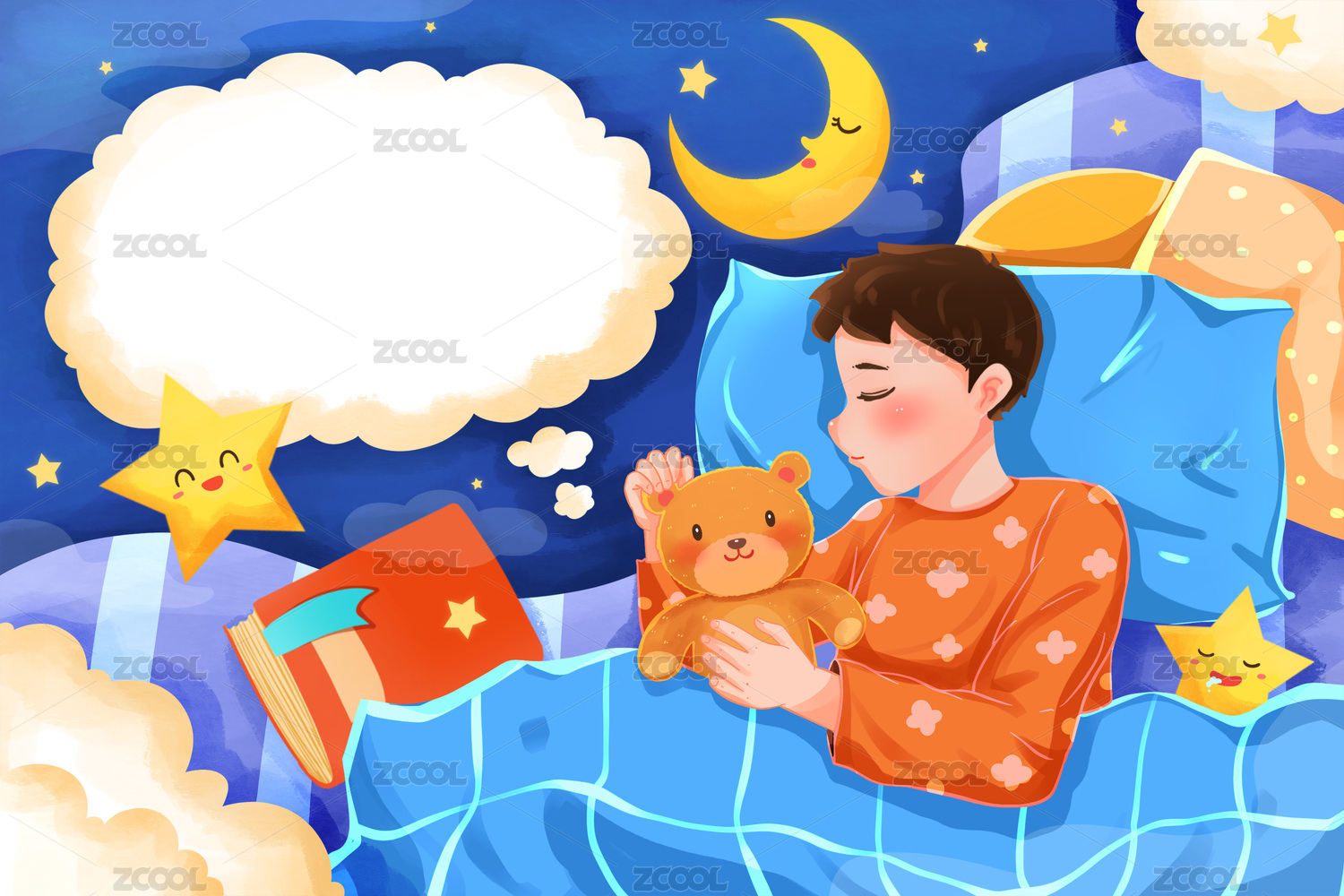 夜晚可爱的小男孩在玩具陪伴下睡觉插画