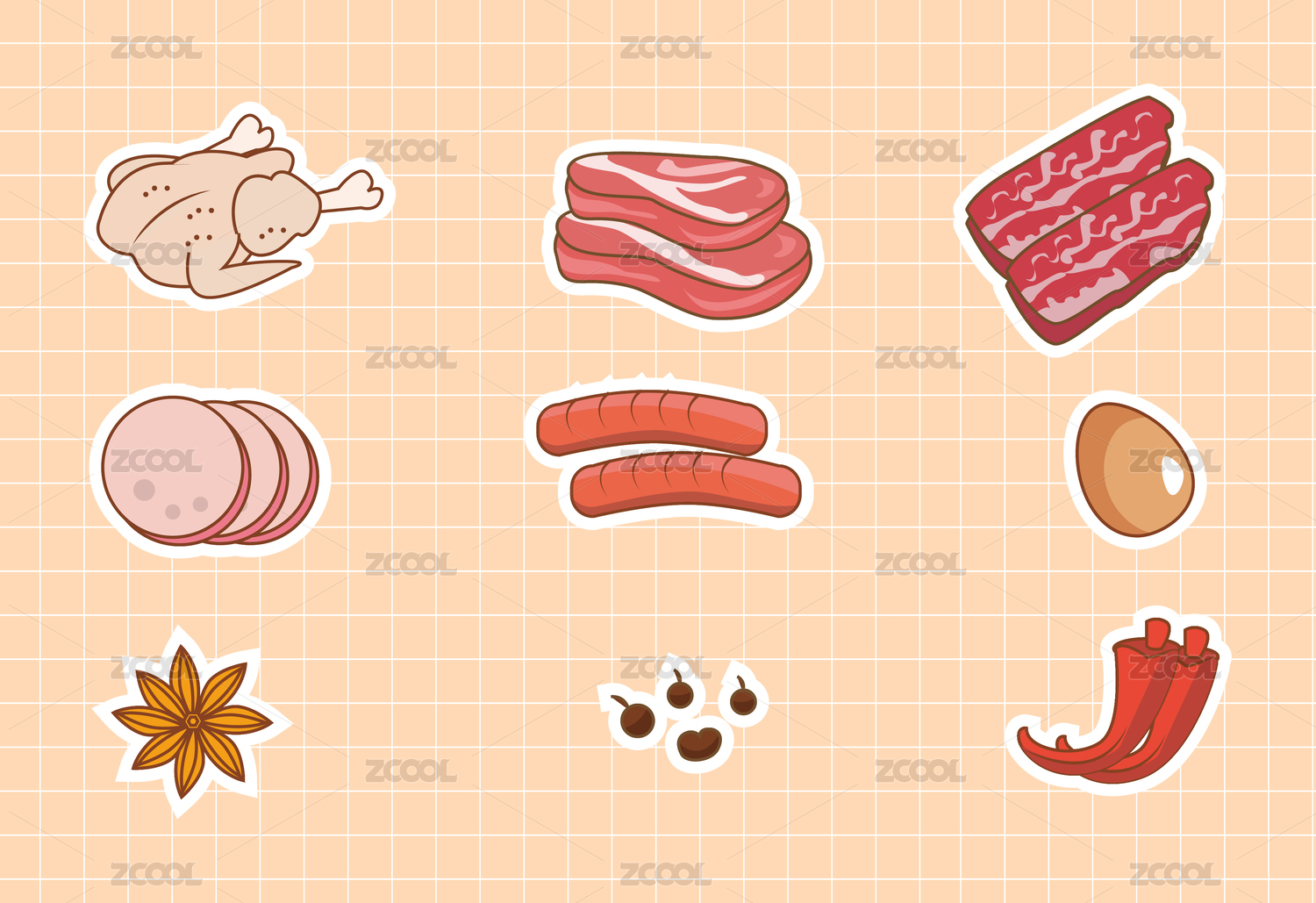 中国传统食物食材肉类小料粗描边矢量插画贴