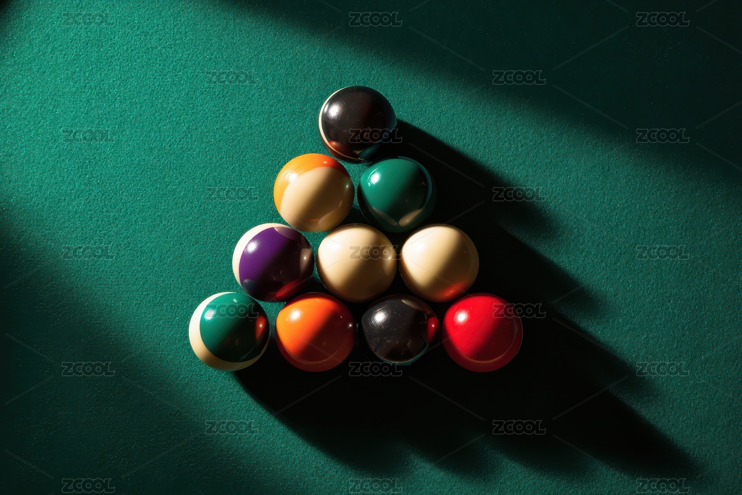 桌球排布在绿色台面上的光影效果