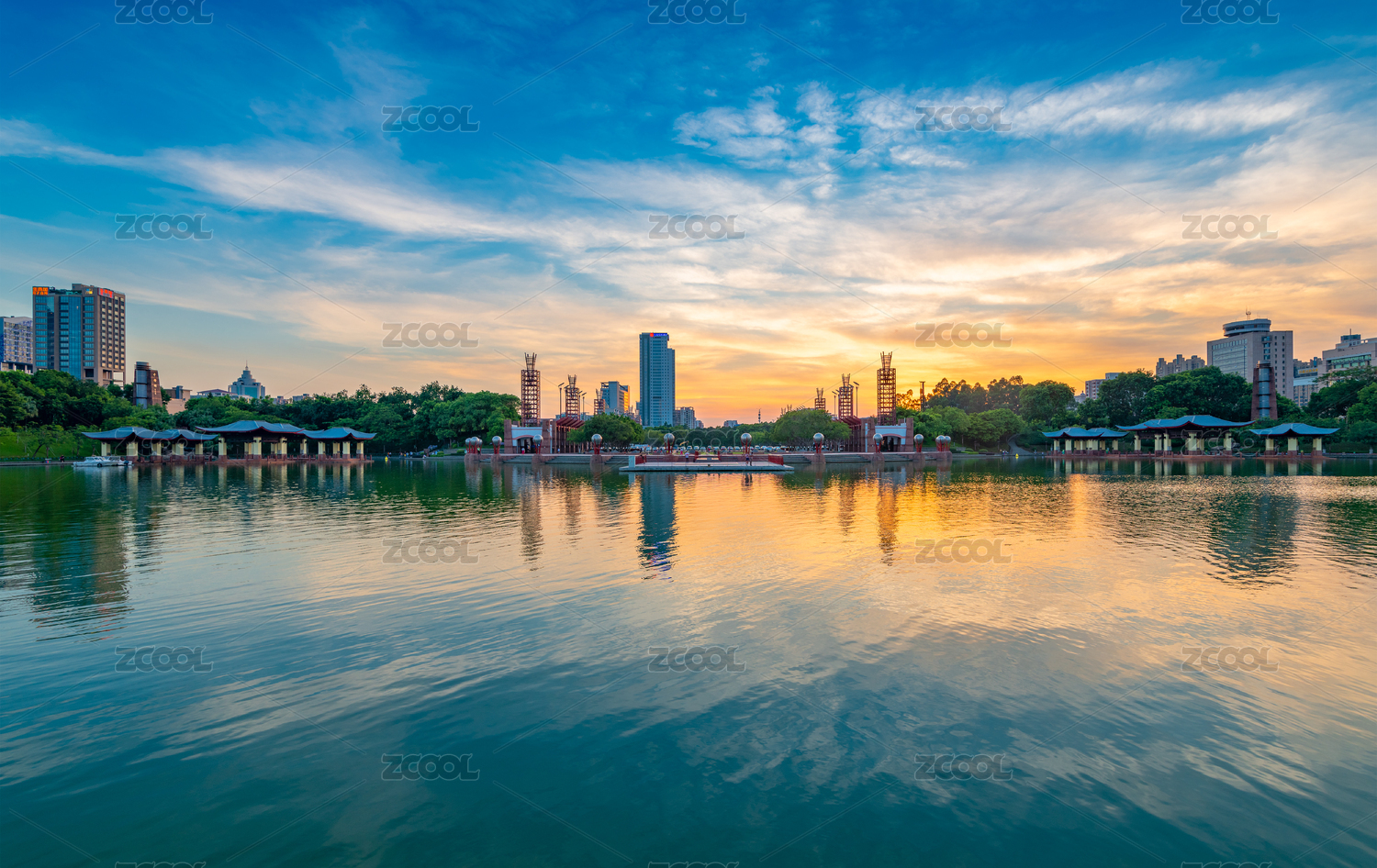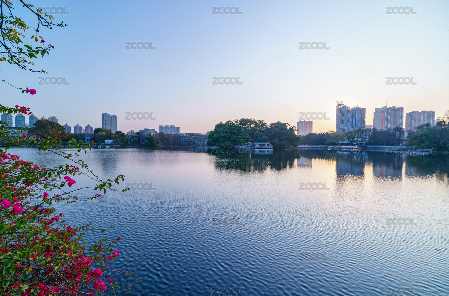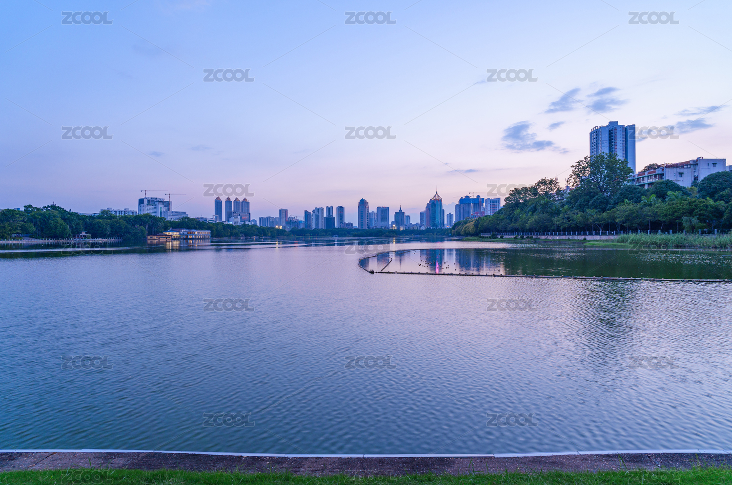 南宁南湖公园夕阳黄昏与城市摩天大楼建筑