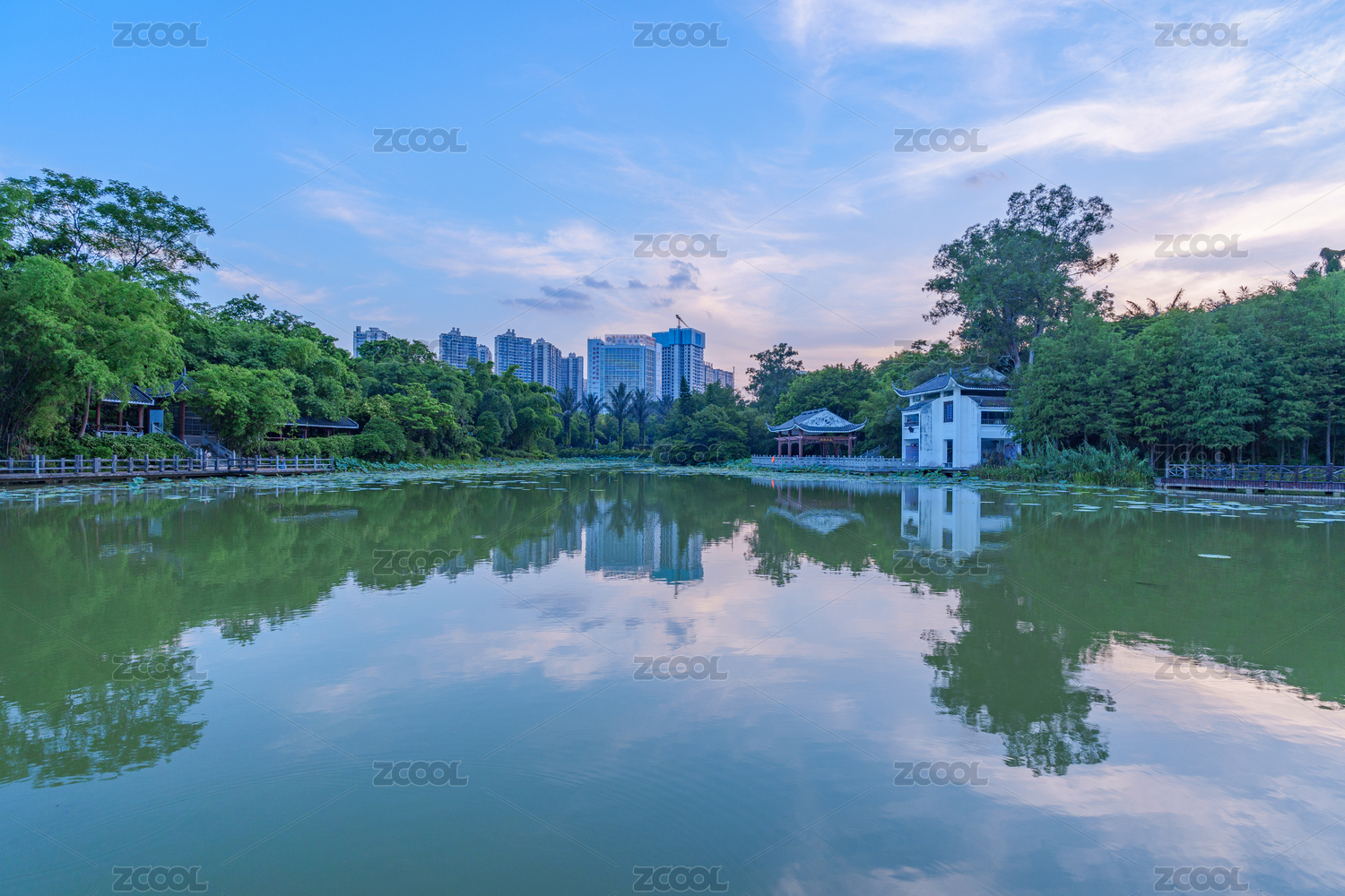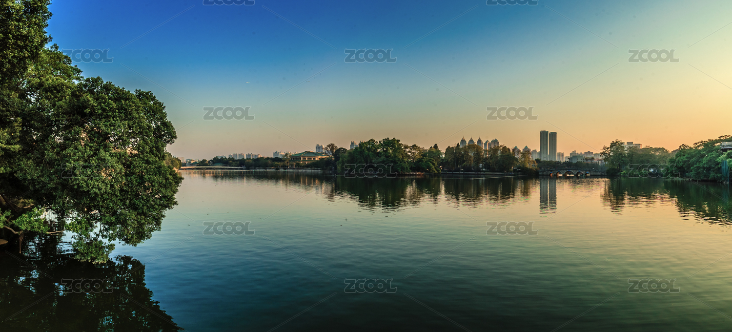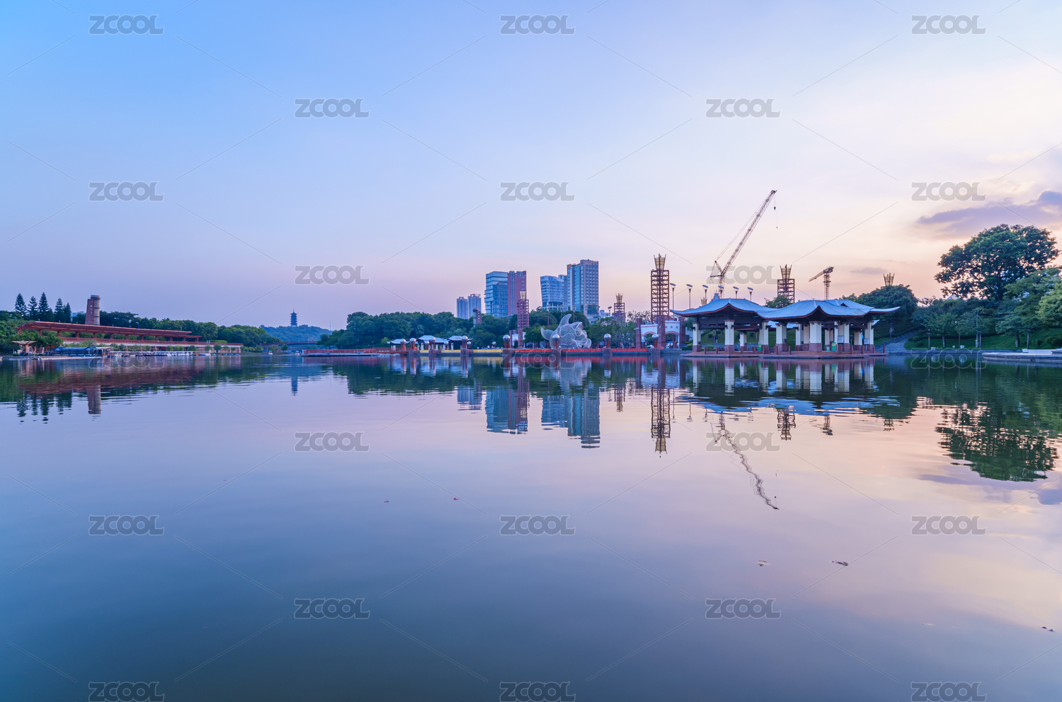 南宁南湖公园夕阳黄昏与城市摩天大楼建筑