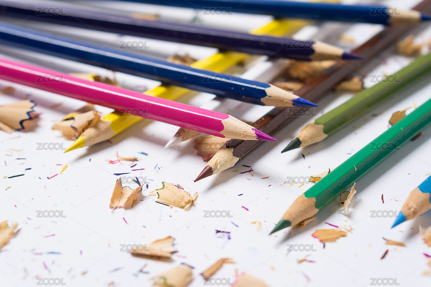 白色背景中的彩色铅笔与散乱的铅笔屑