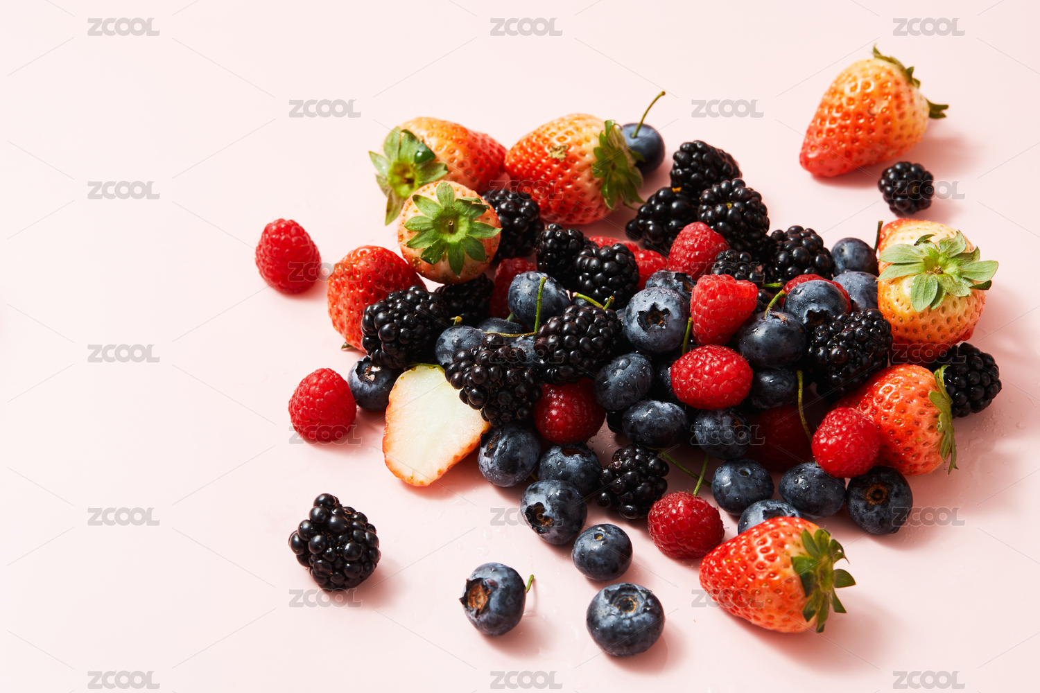 粉色背景上的多种莓果