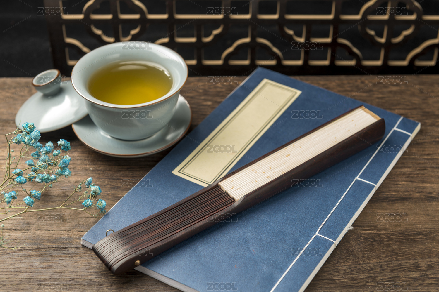 俯视桌子上的古旧书籍和毛笔及放在书上的一碗茶