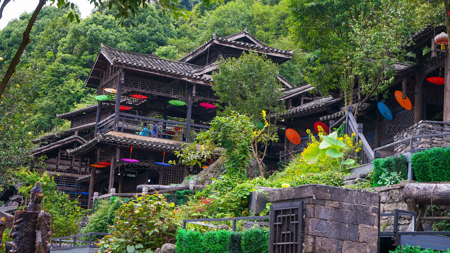 湖南湘西苗王寨的石板阶梯与石墙建筑