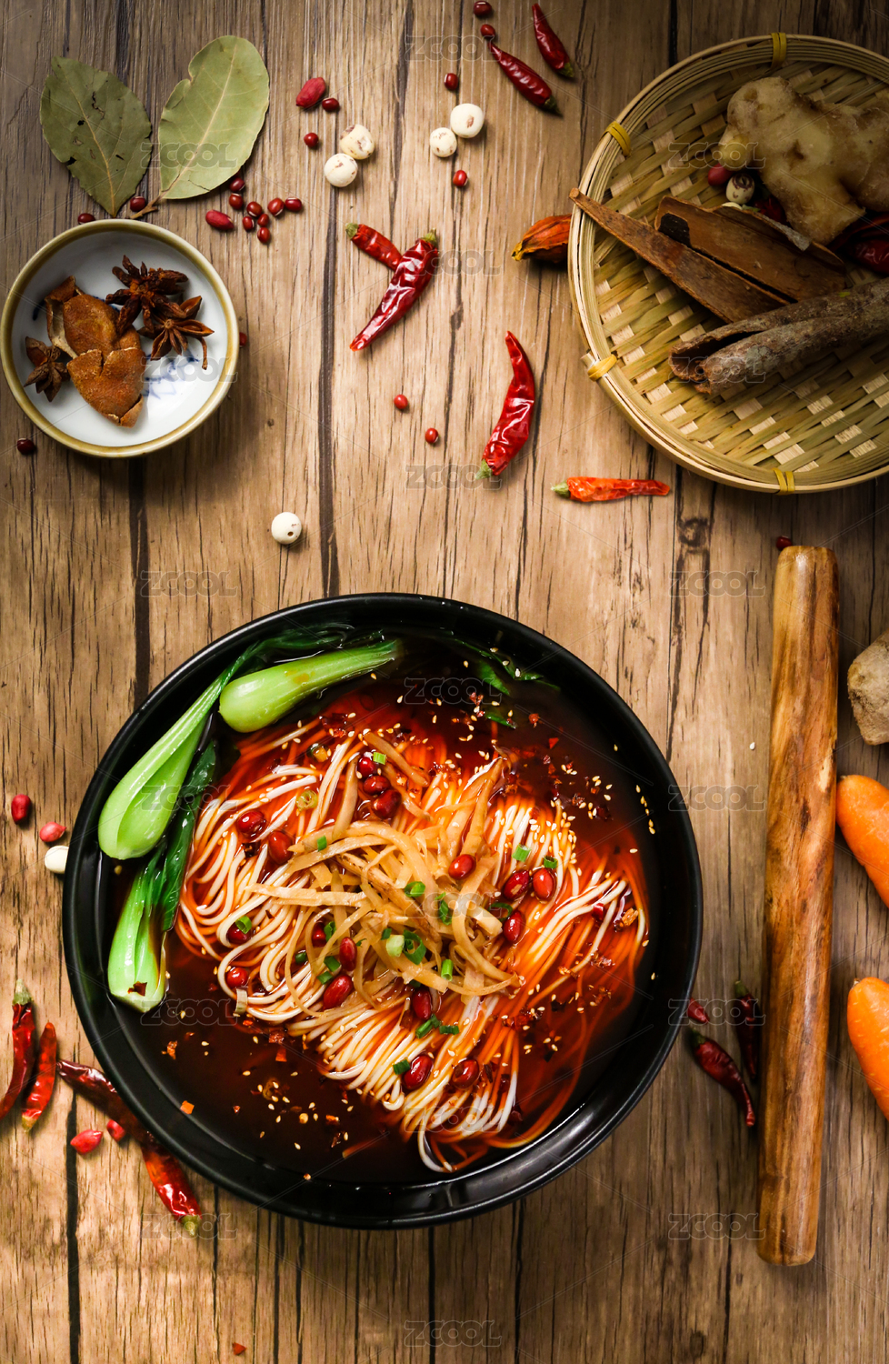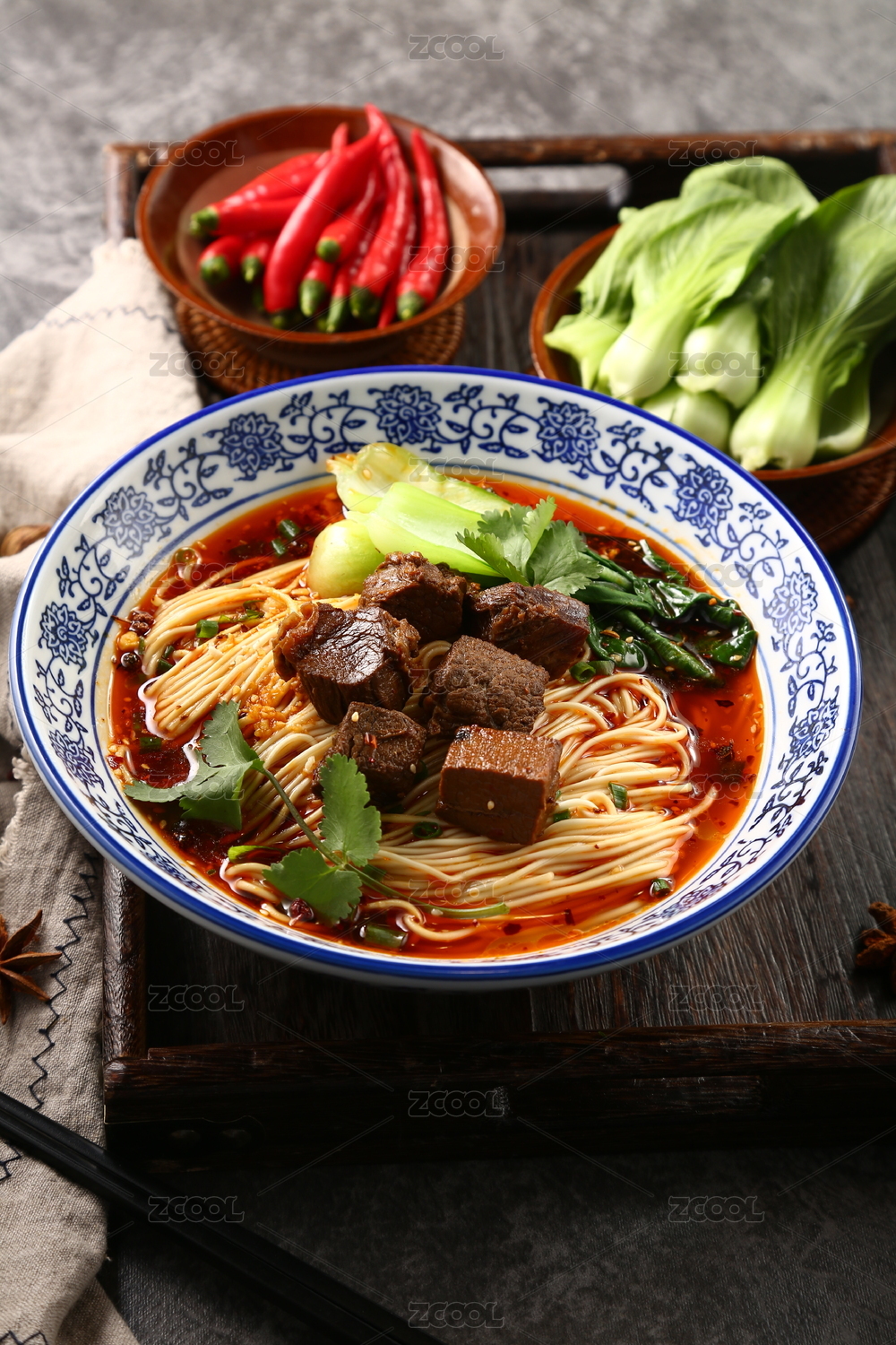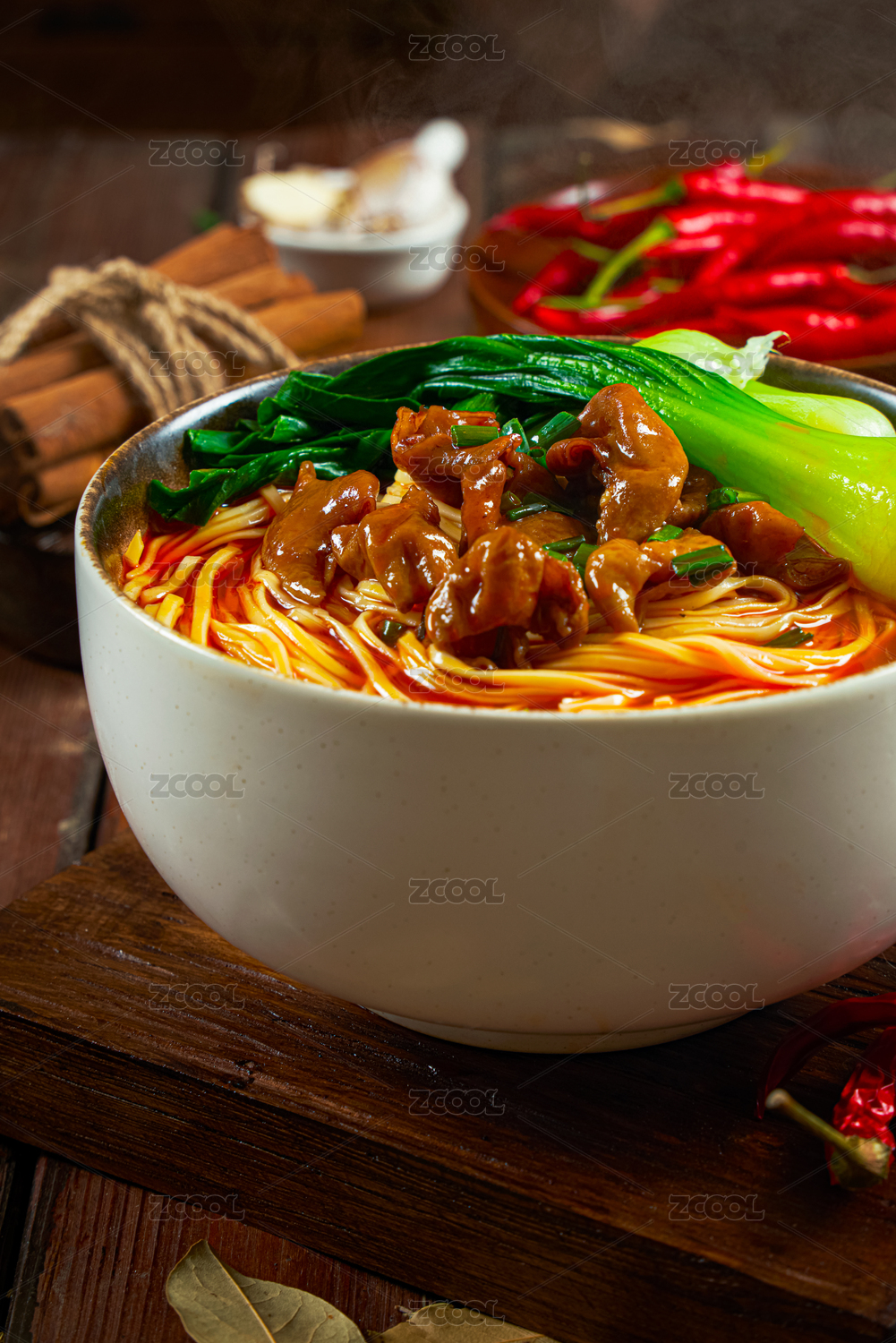 木桌上一碗香辣的红汤牛肉面的竖构图