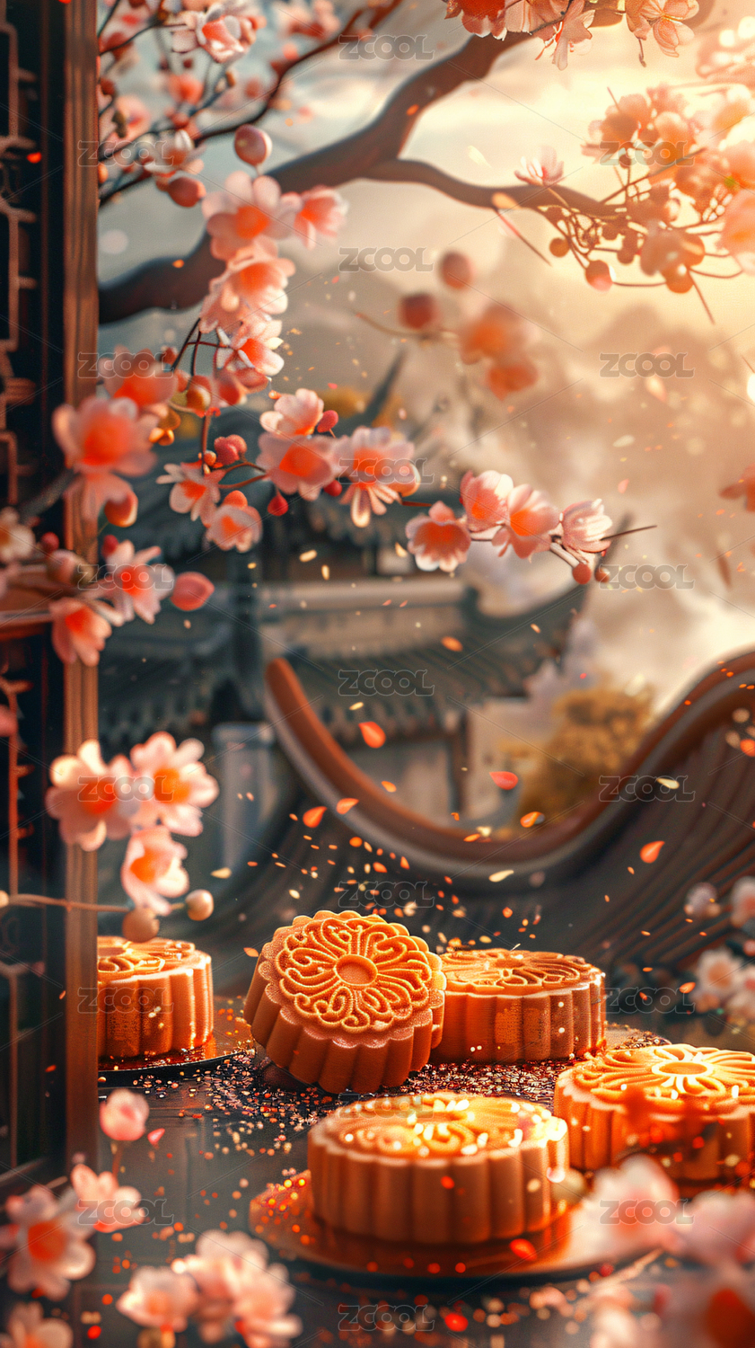 中秋月圆唯美夜色窗边月饼中式糕点图