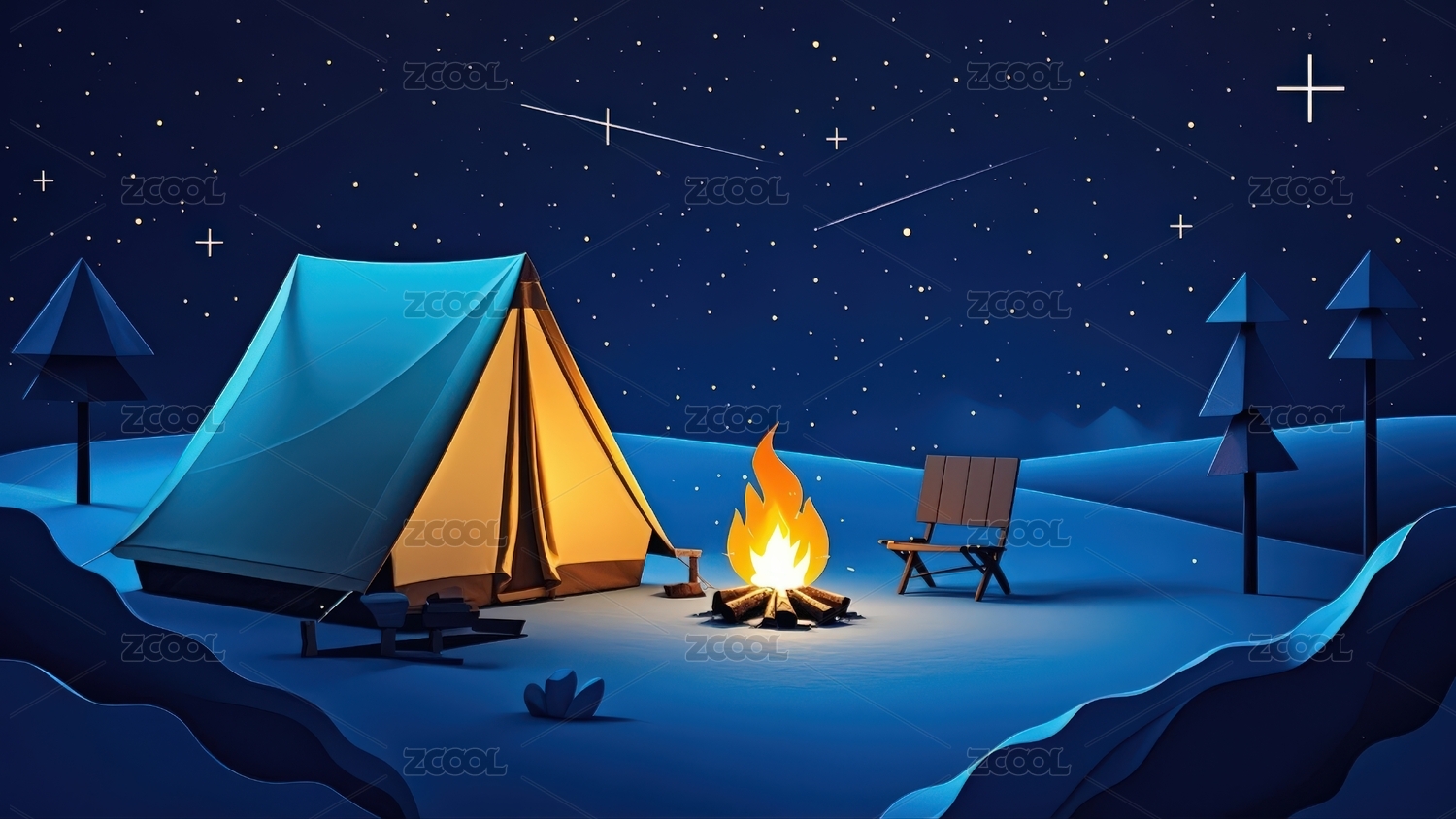纸艺风格的冬日帐篷与篝火