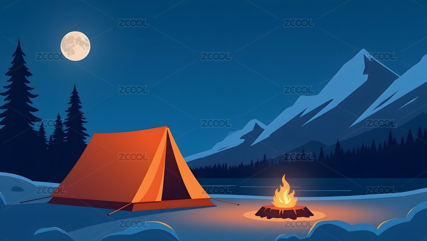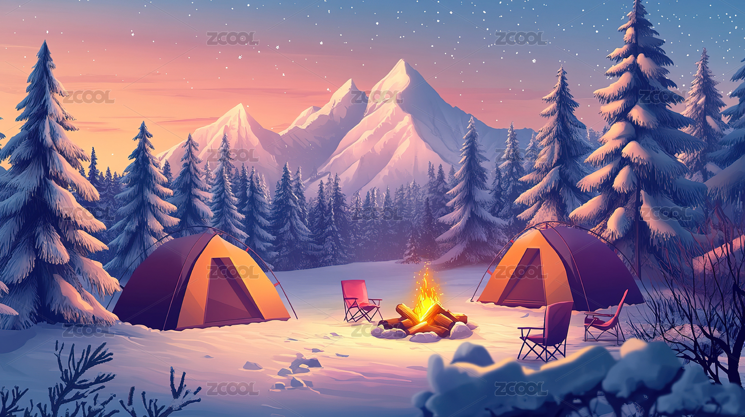 雪地夜晚的篝火和帐篷插画场景横