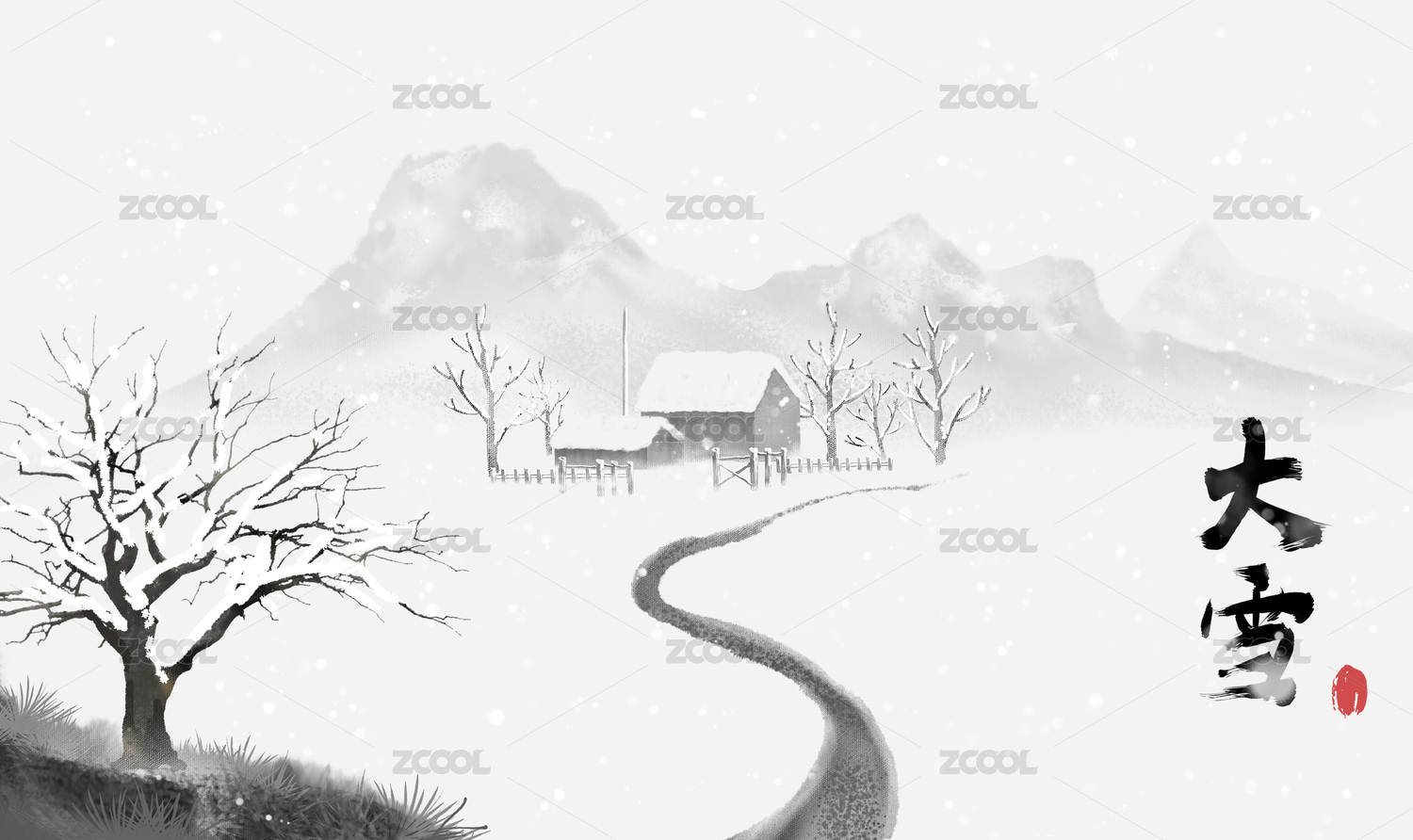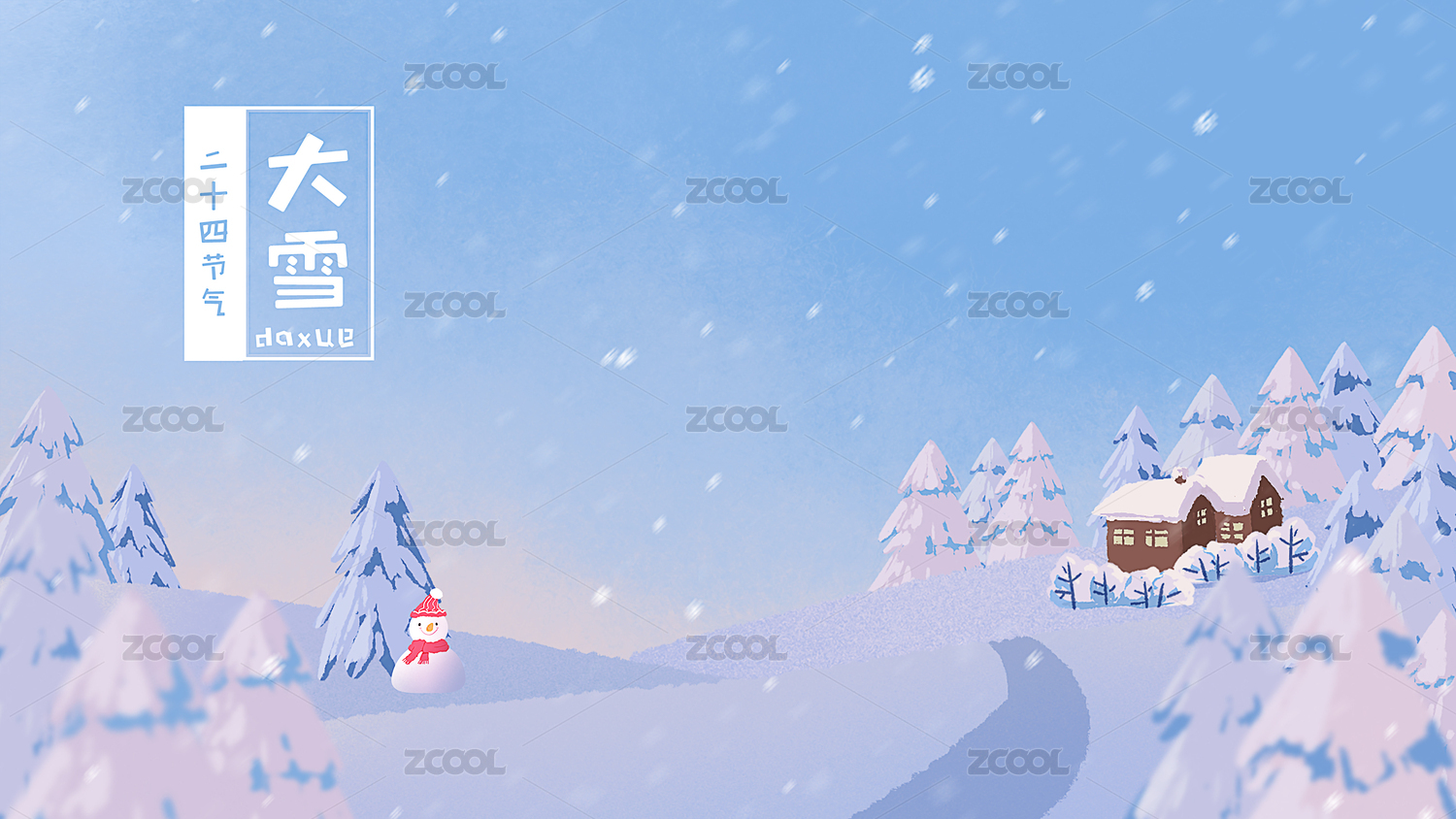 大寒节气冬天芦苇丛后山坡上玩耍的孩子清新景观插画横版字