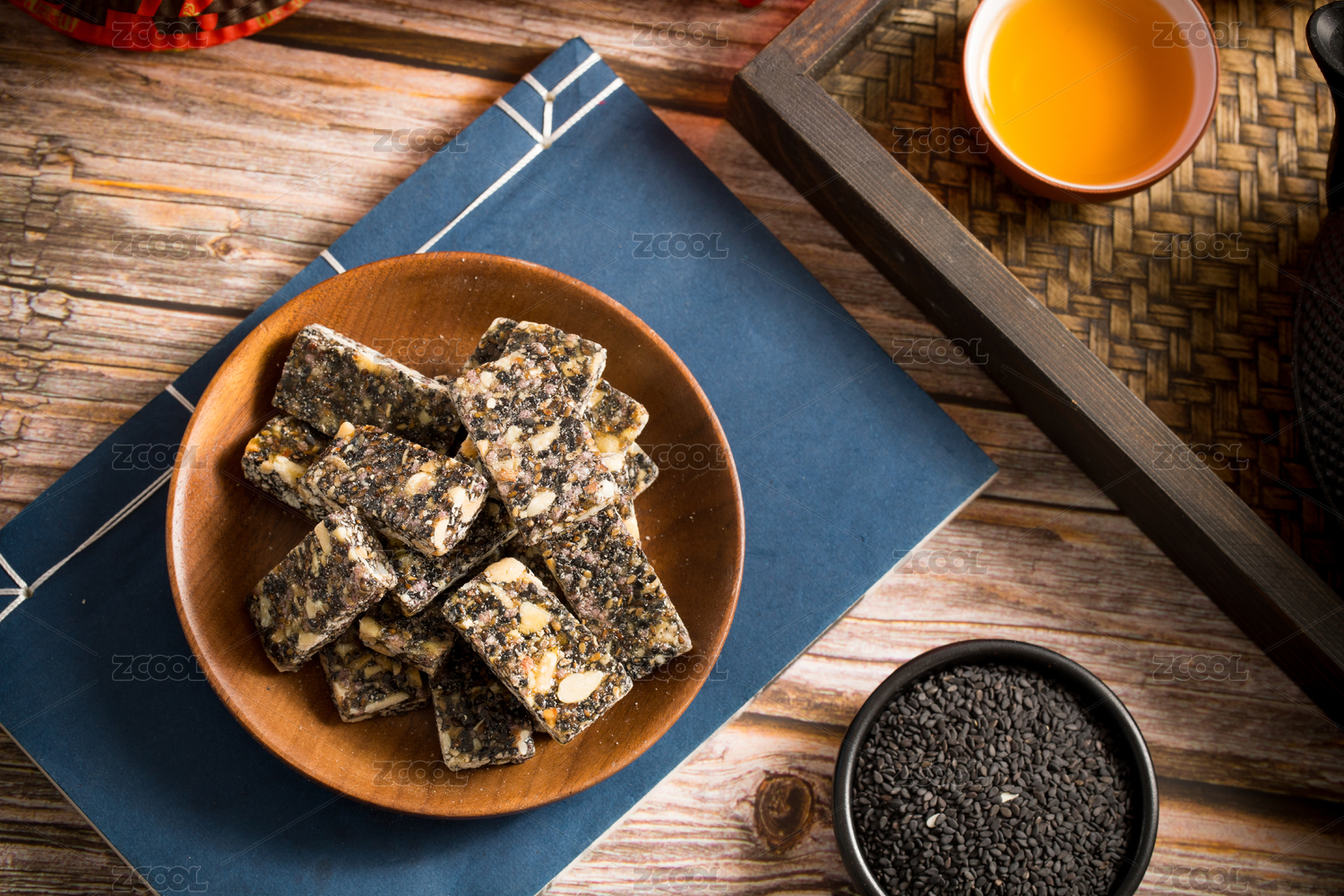 用木盘装着放在古书上传统点心黑芝麻糖俯拍