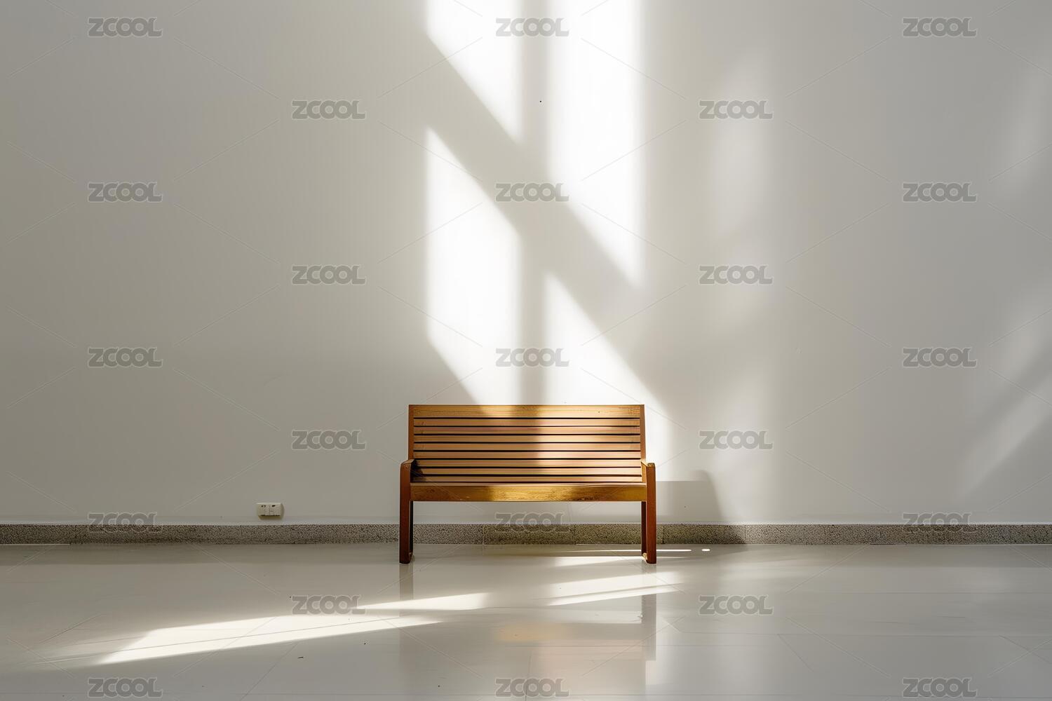 白色房间内木质长凳沐浴阳光