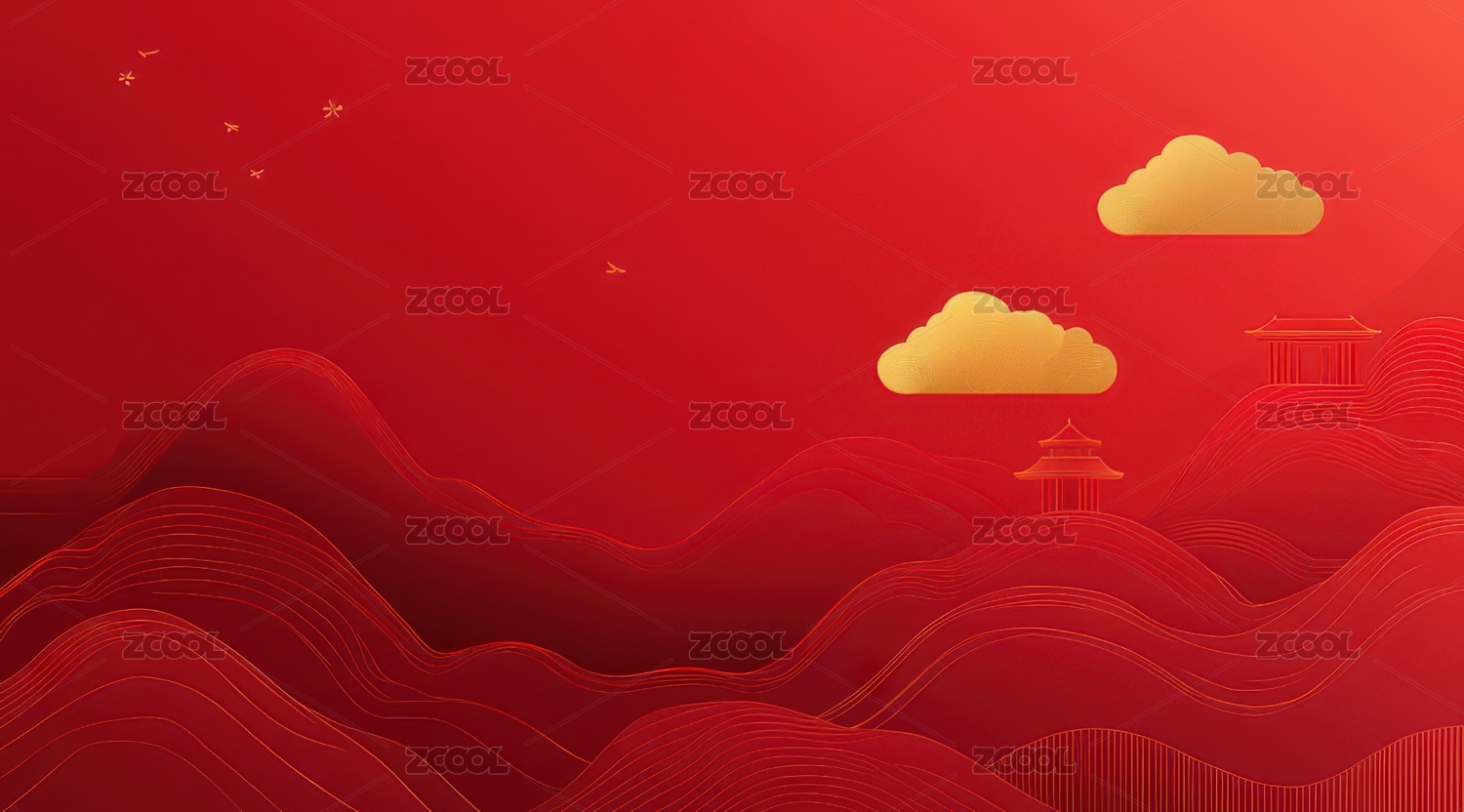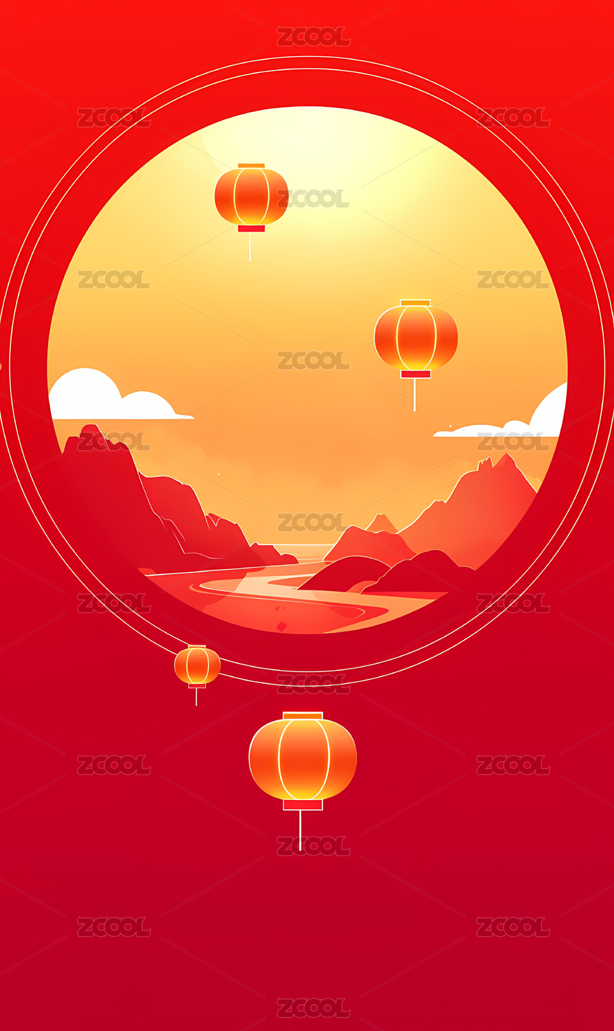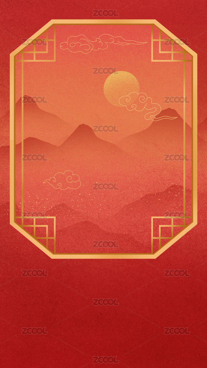 中秋节中国风红色新年古典淡雅山峰窗户风景