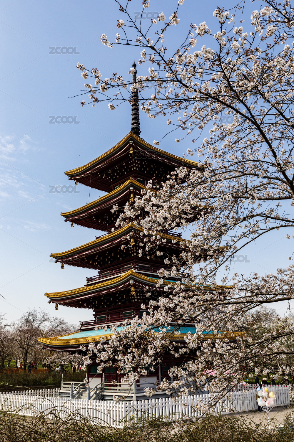 武汉东湖磨山樱园,日式五重塔建筑与樱花