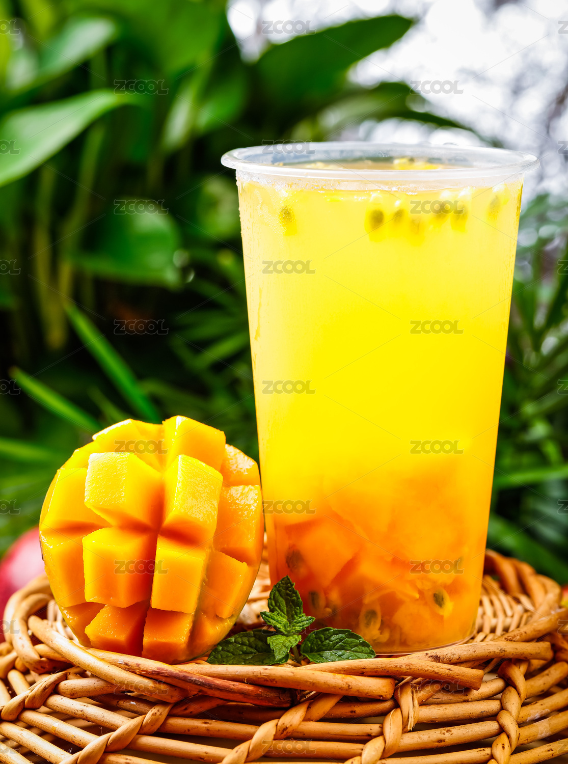 木底上放着一杯百香果果汁