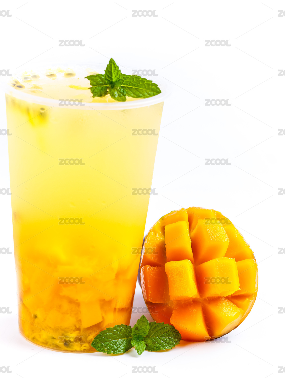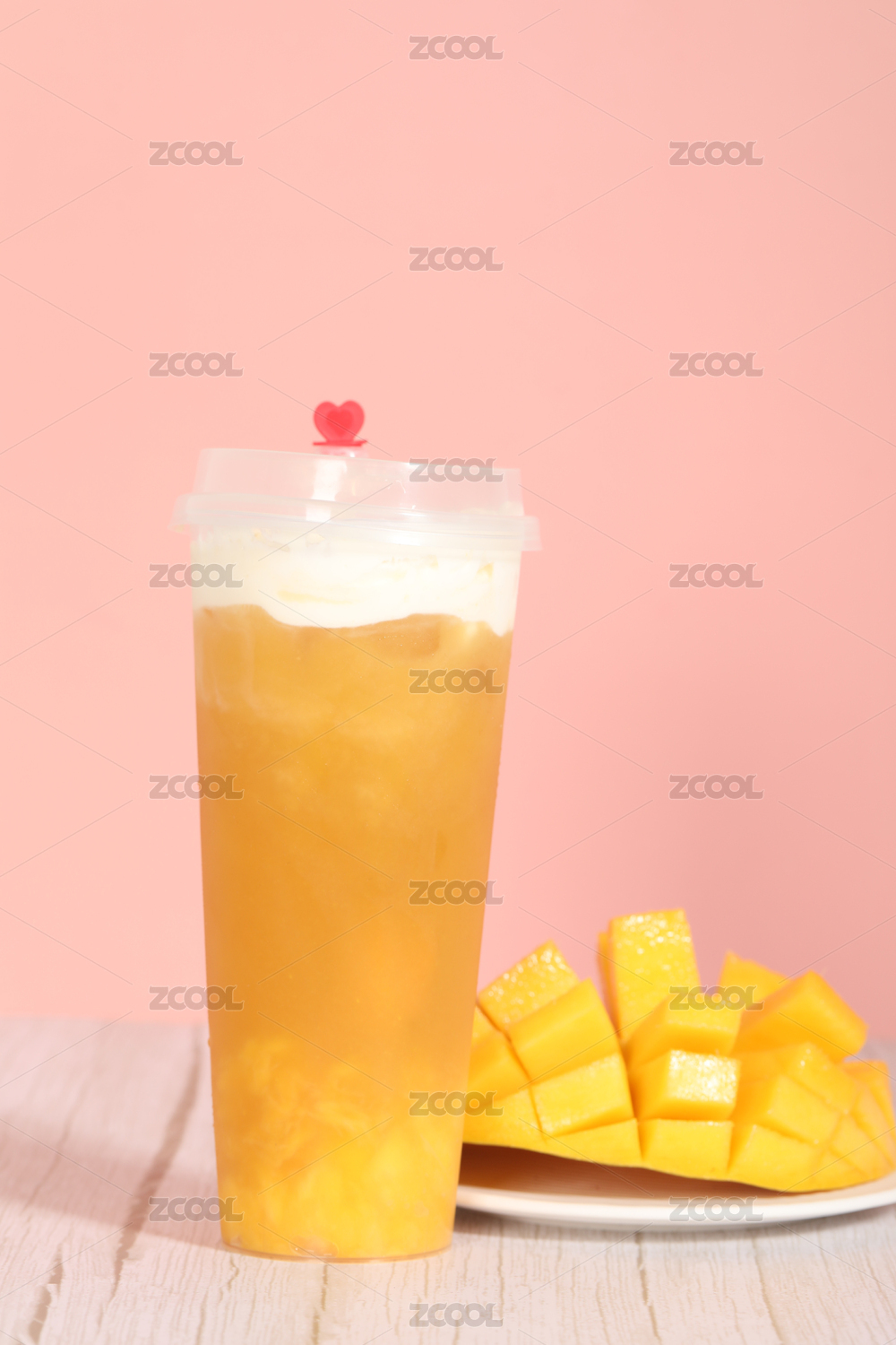 白底上放着一杯芒果汁