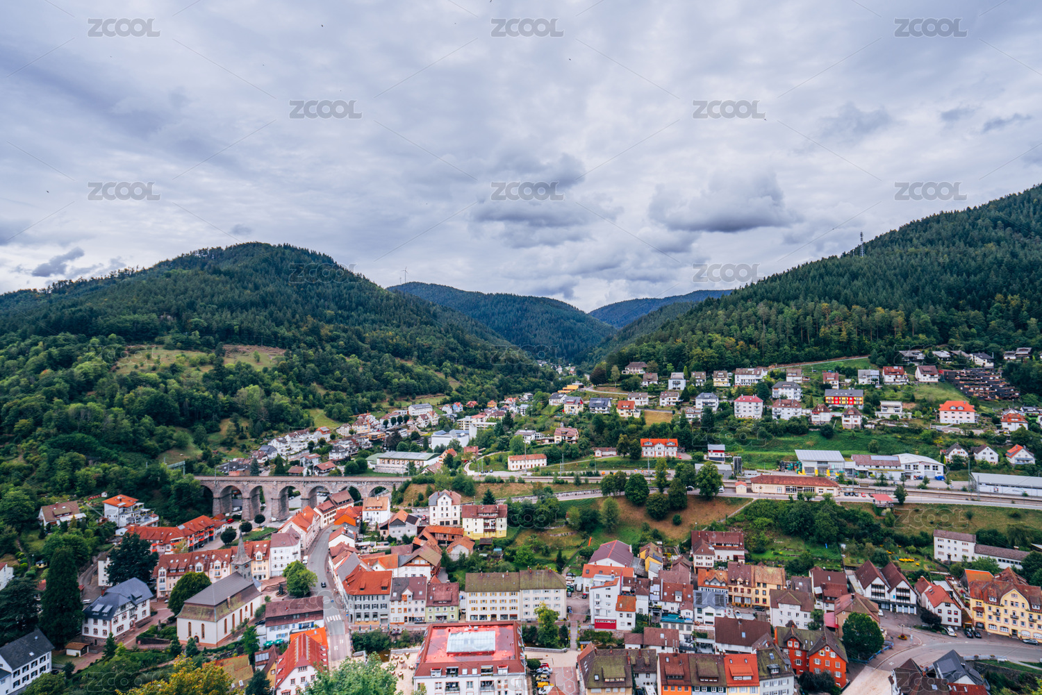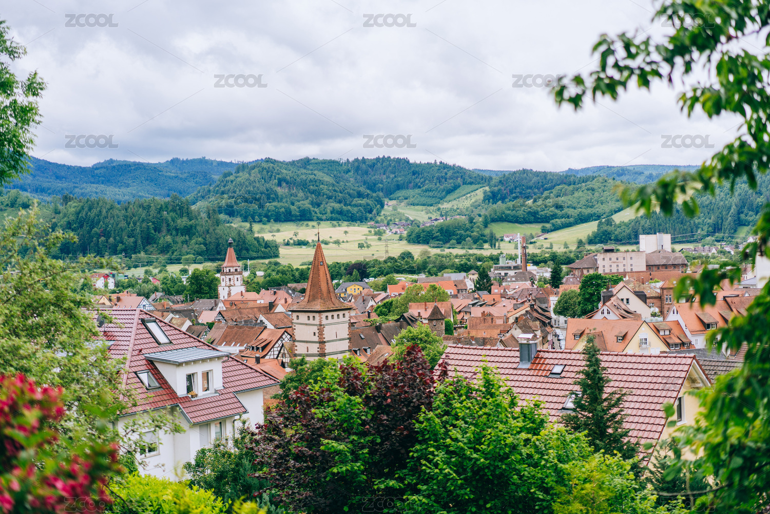 眺望欧洲黑森林山脉深处的美丽童话小镇
