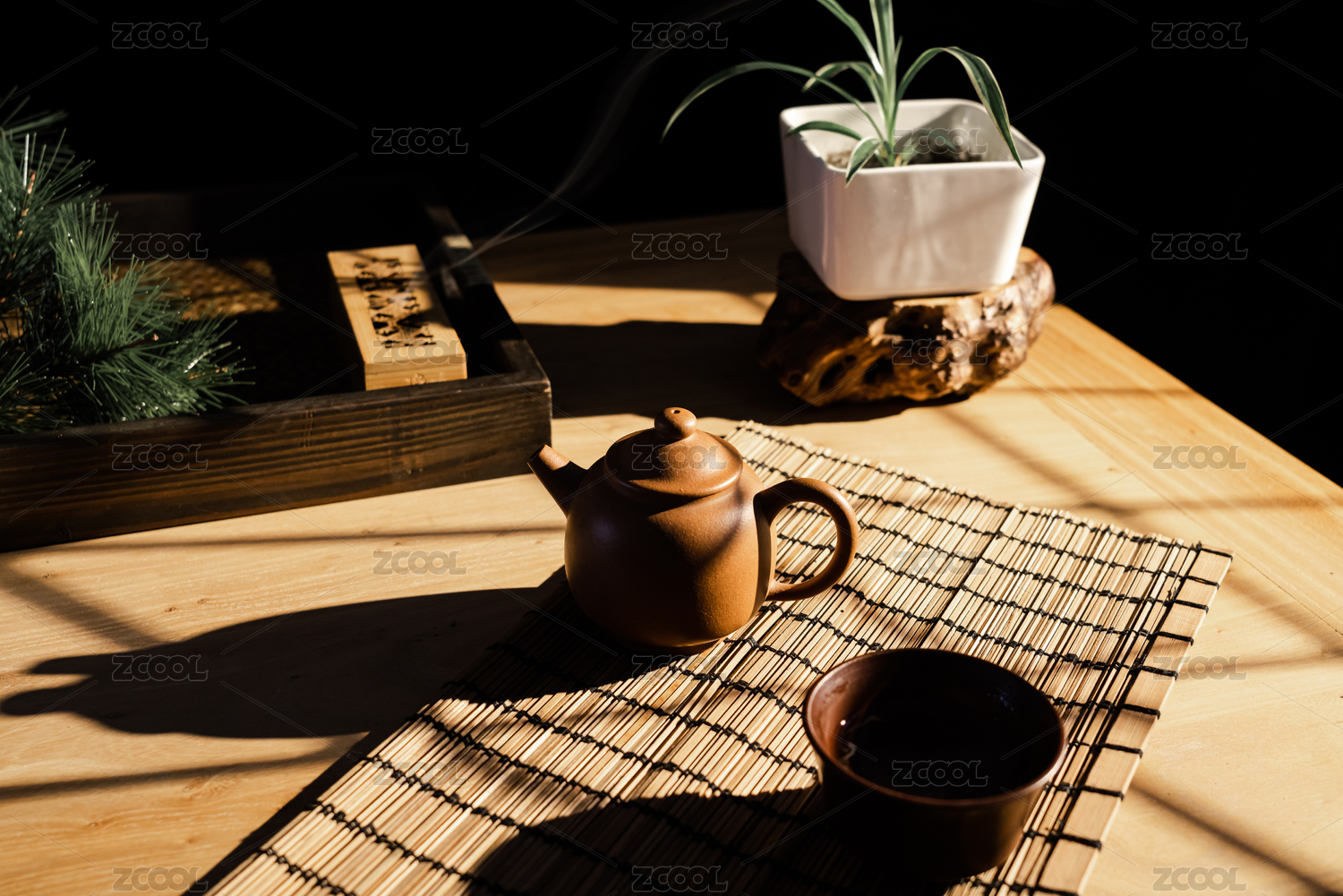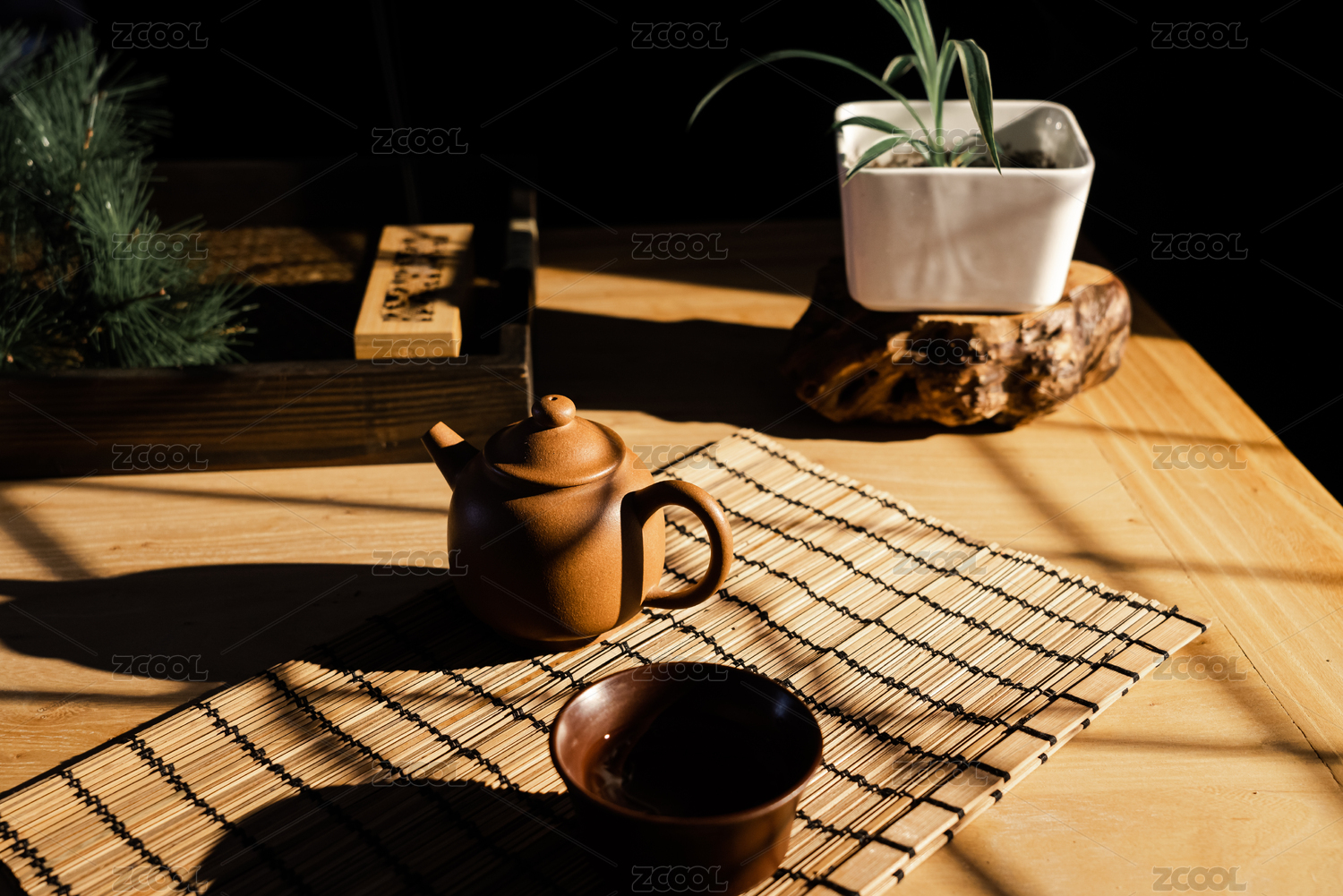 午后阳光照在摆着紫砂壶的木质桌子上