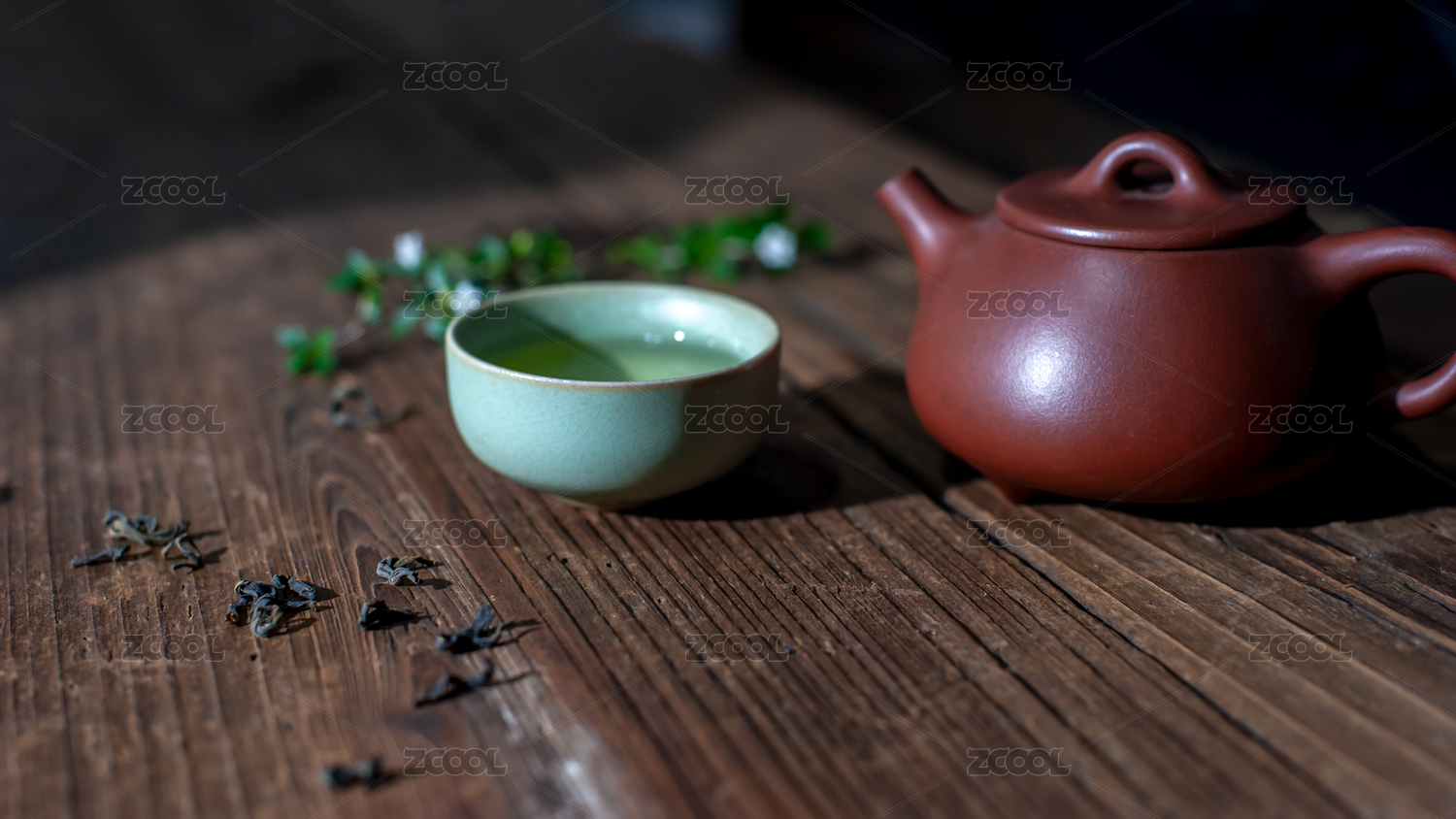 一个紫砂壶和装着茶水的汝窑茶杯放在旧木板上