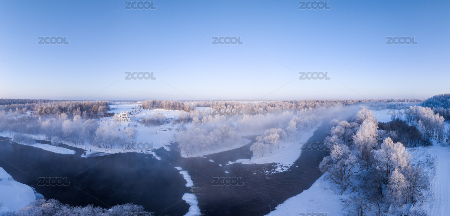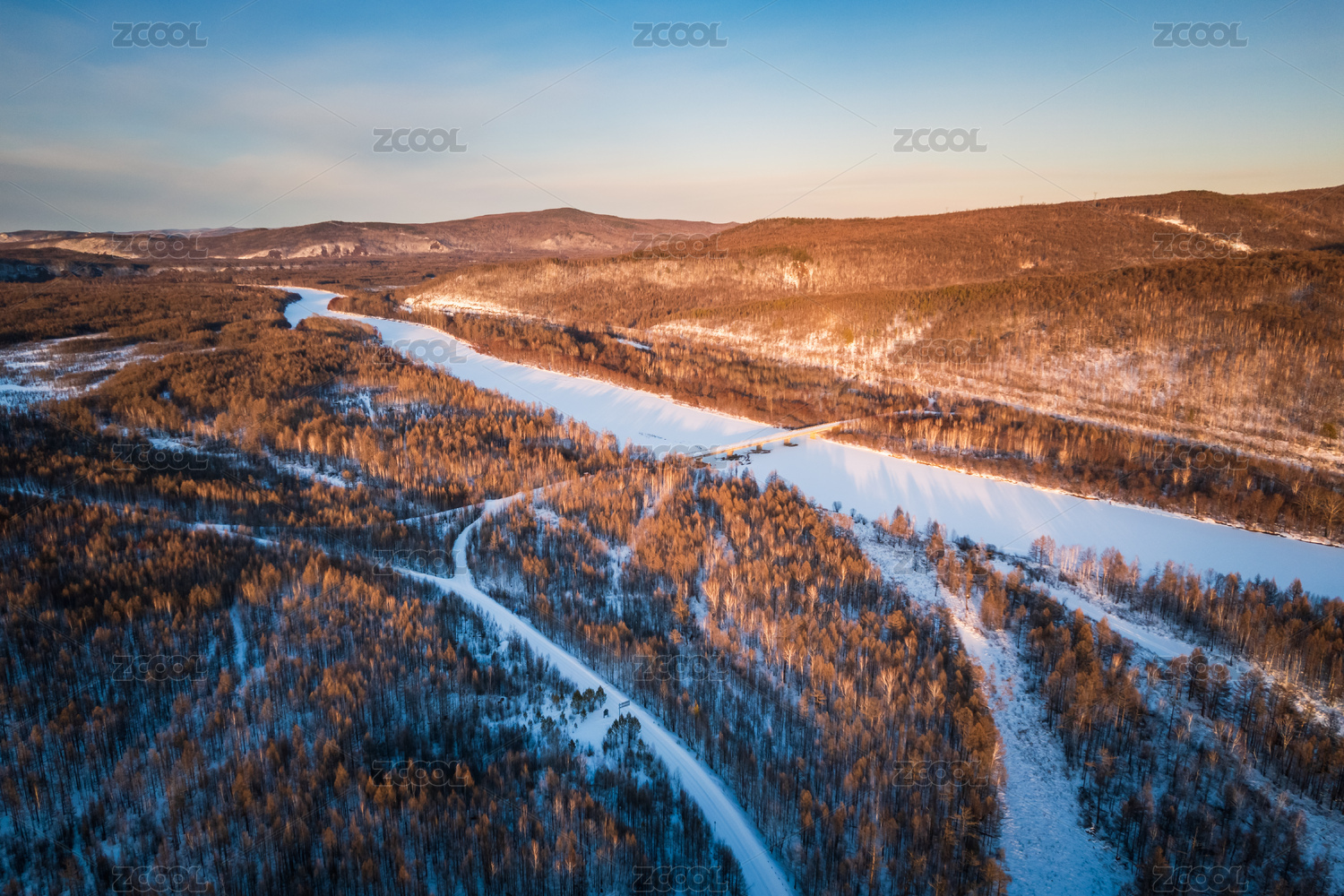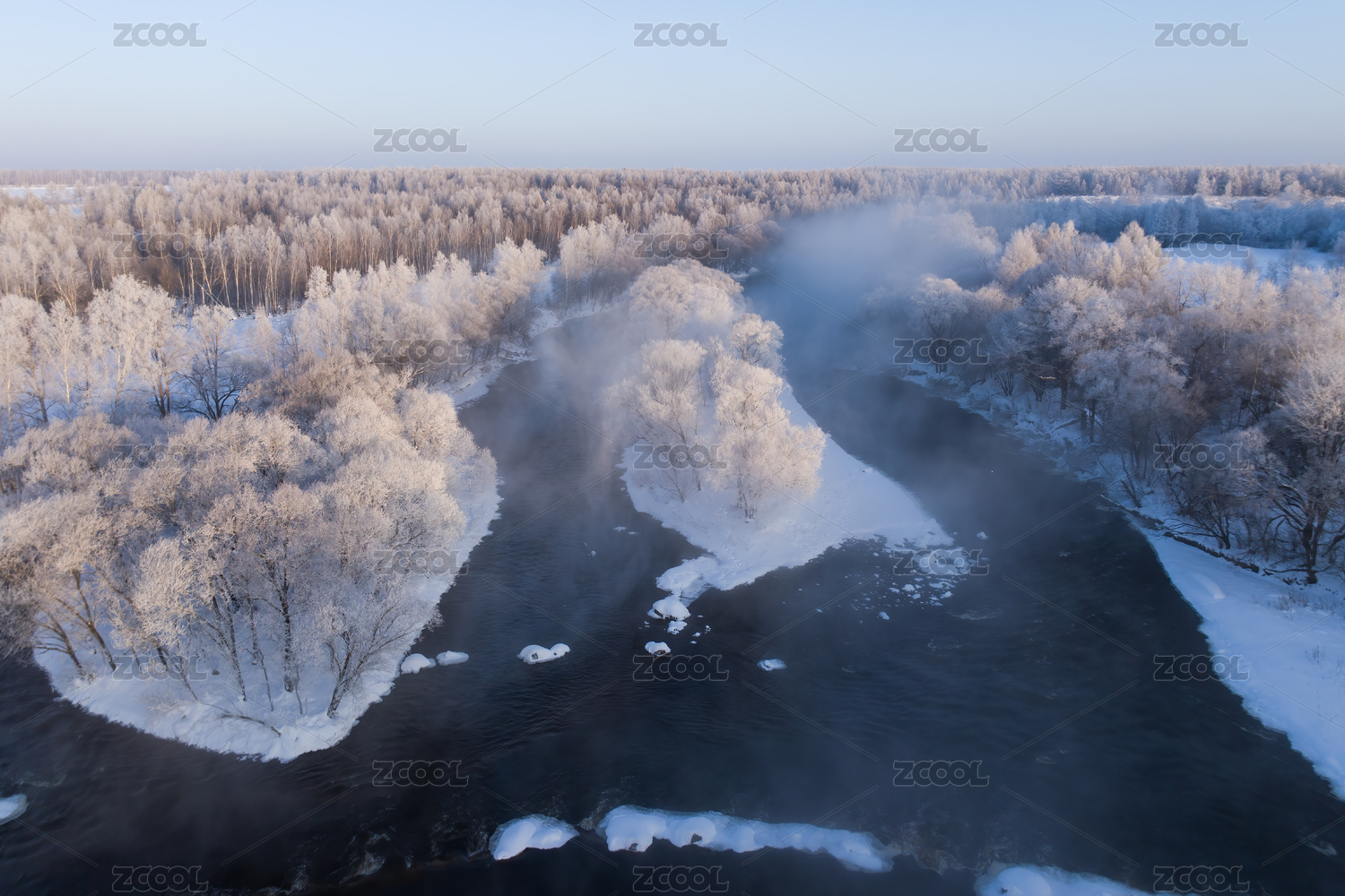 中国黑龙江第一湾冬天冰封雪堆的河流现象