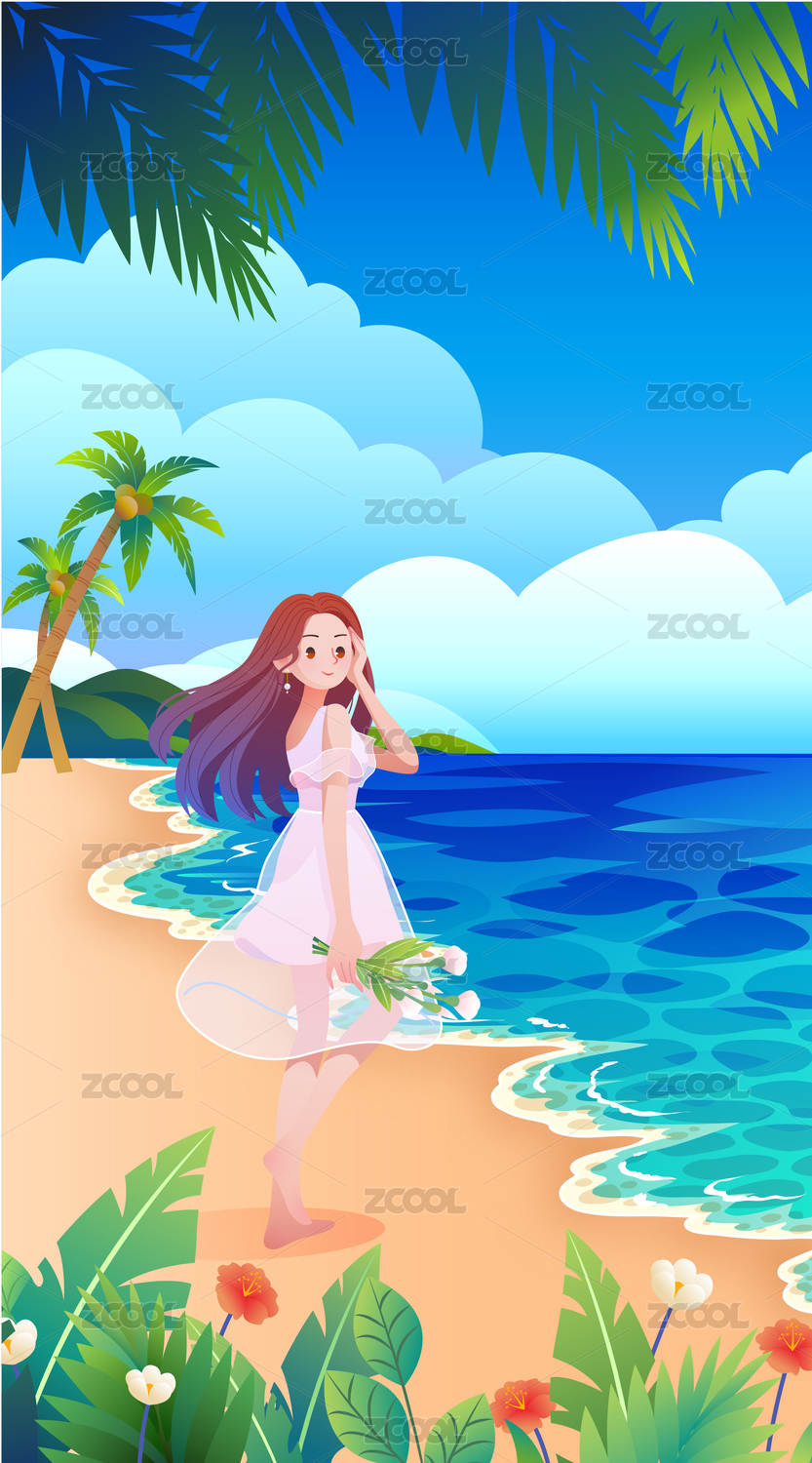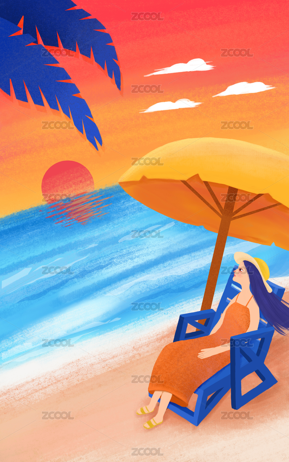 女生在海边椰子树下在躺椅上晒太阳竖版