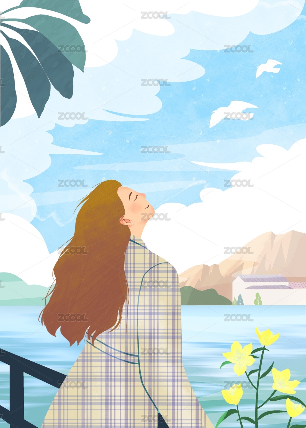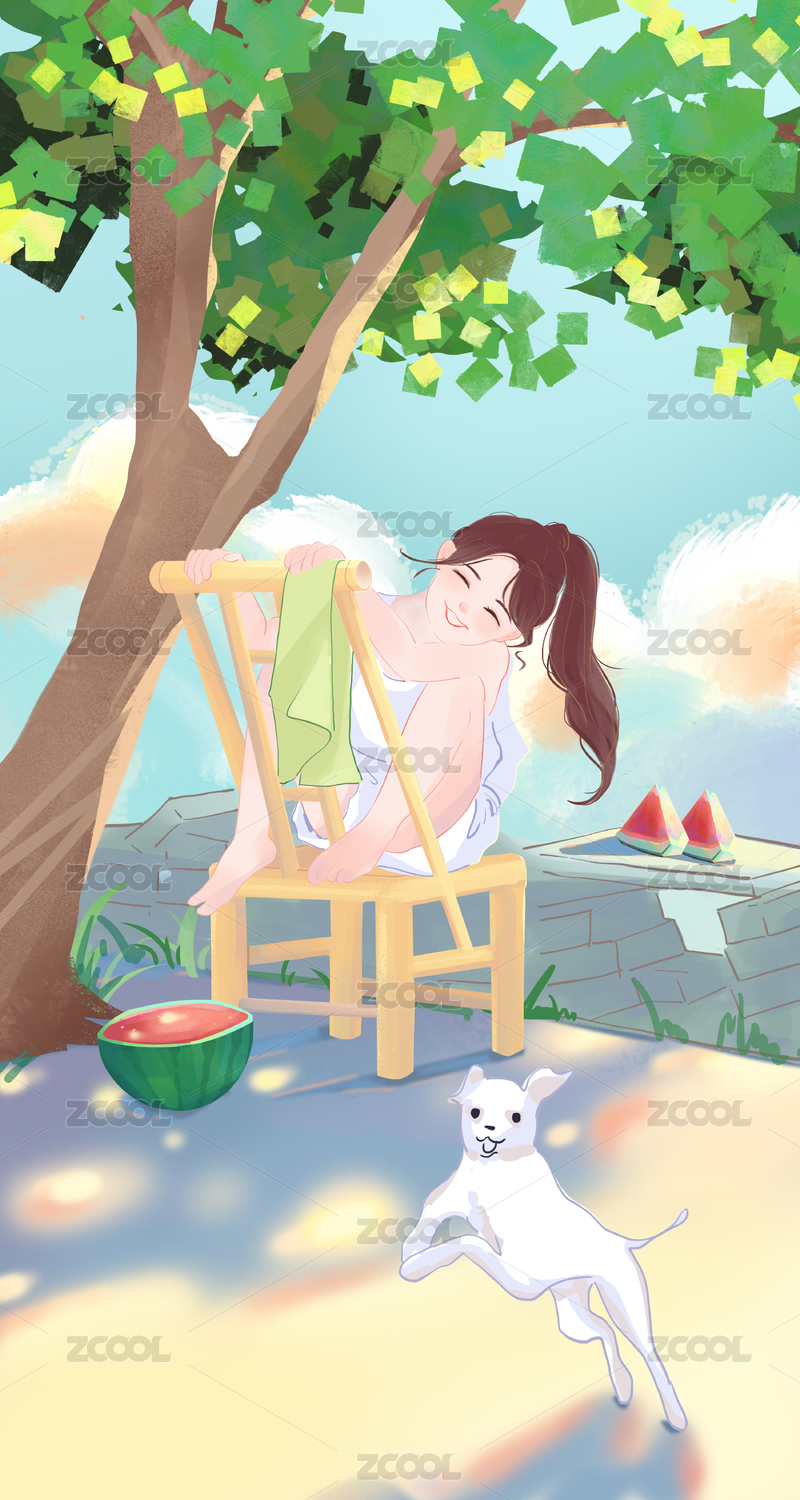 女孩坐在荷叶边吃西瓜的背影创意插画-竖