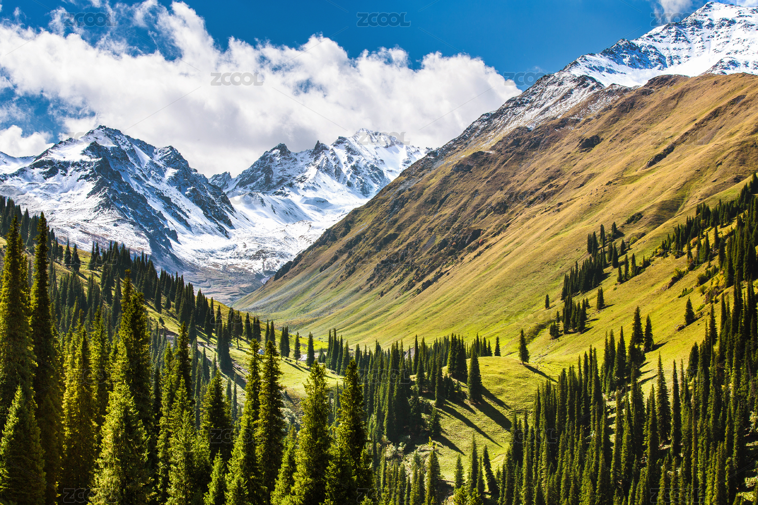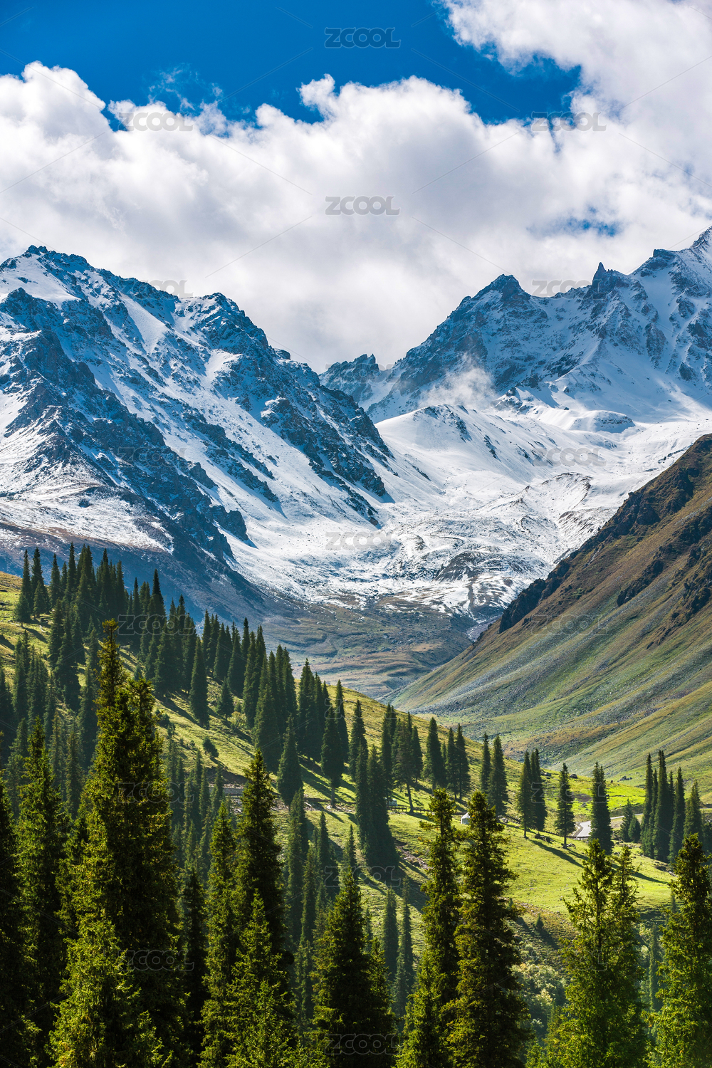 中国新疆夏塔景区的云杉林与雪峰