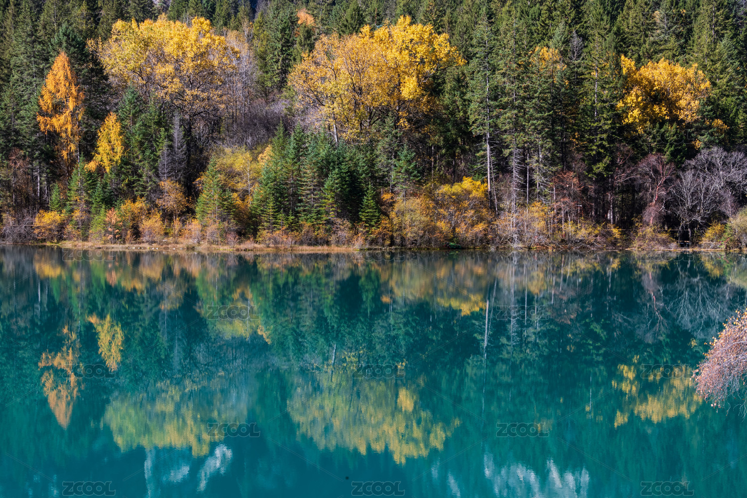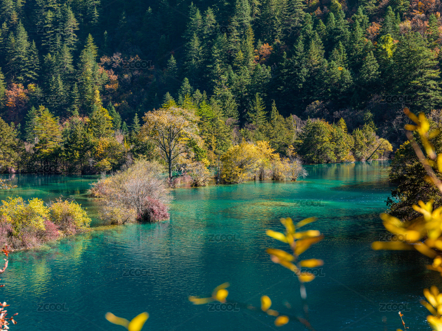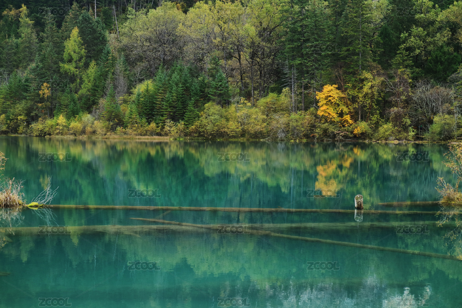 九寨沟箭竹海秋色,长满植物的枯木水面倒影