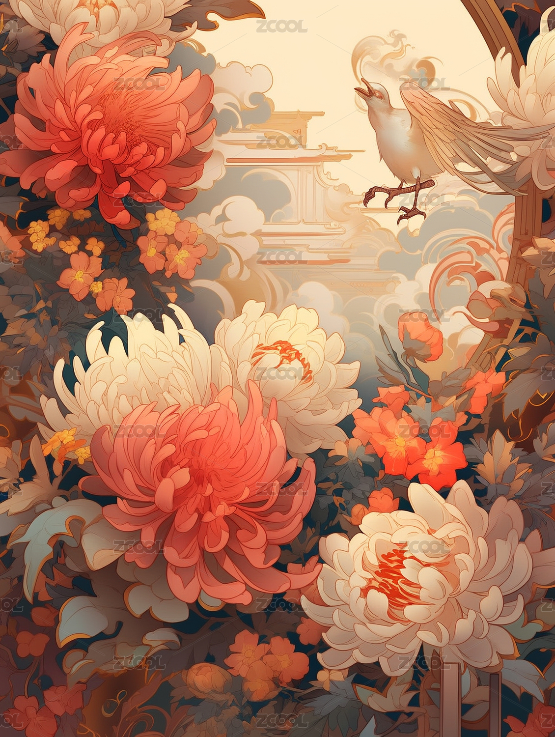 中国风国潮菊花背景插画,重阳节概念插图中