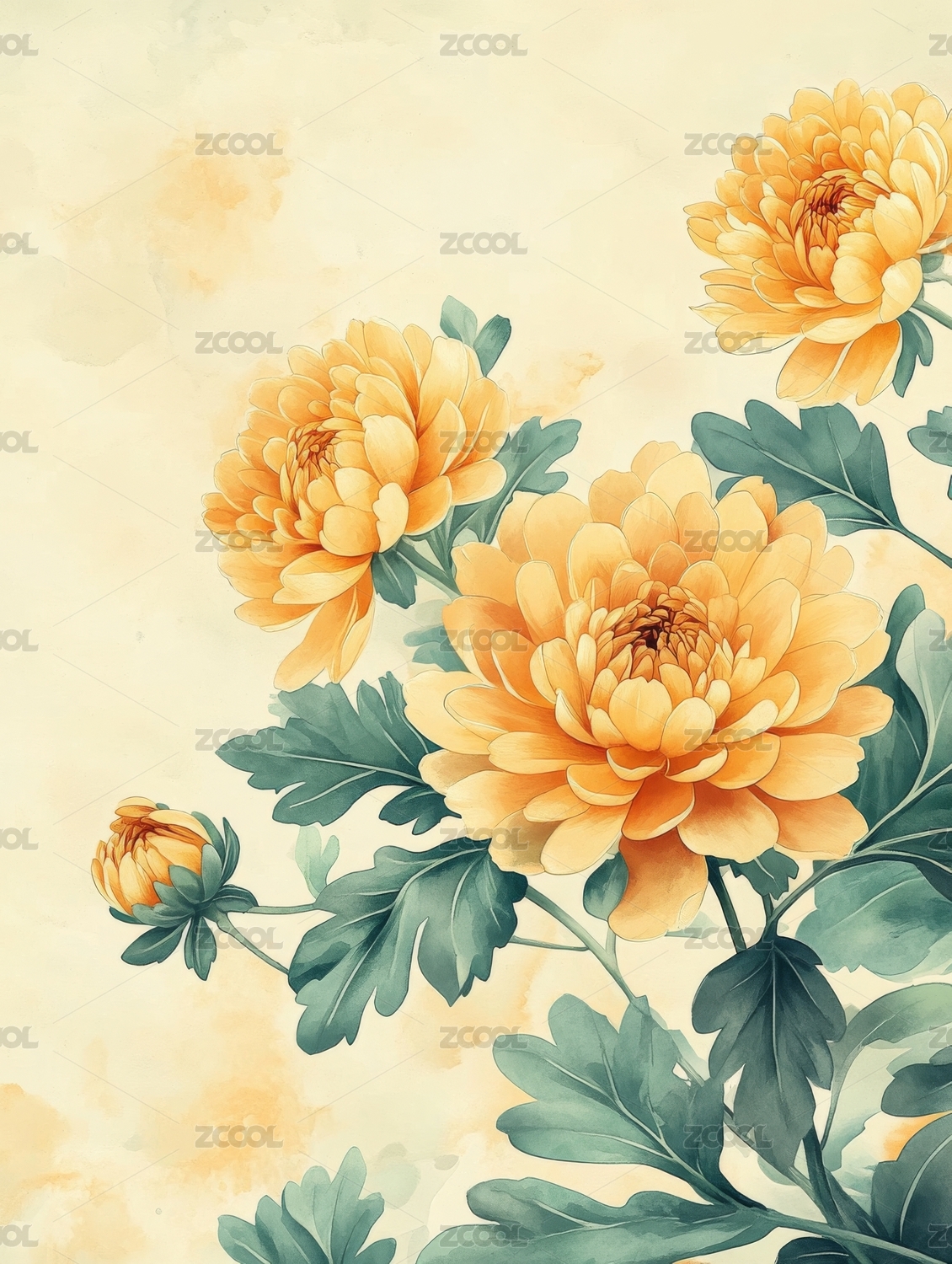 水彩风,菊花,金菊,黄菊,秋菊,花卉,花枝,插画