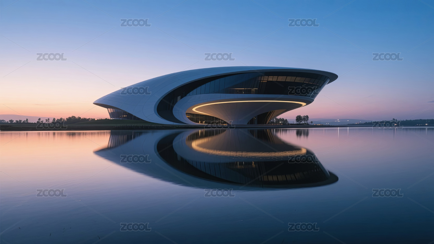 傍晚的流线型风格建筑水面倒影