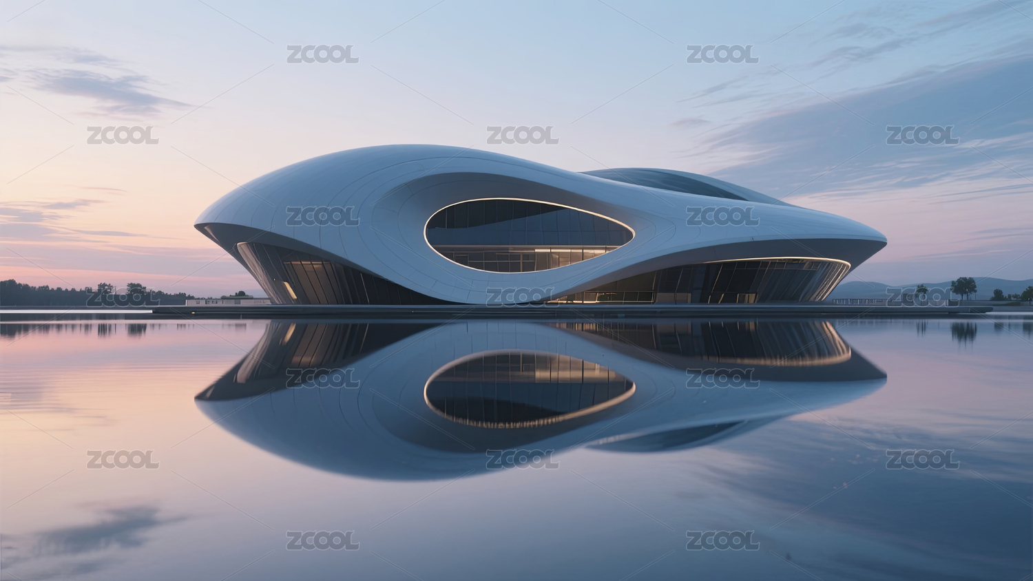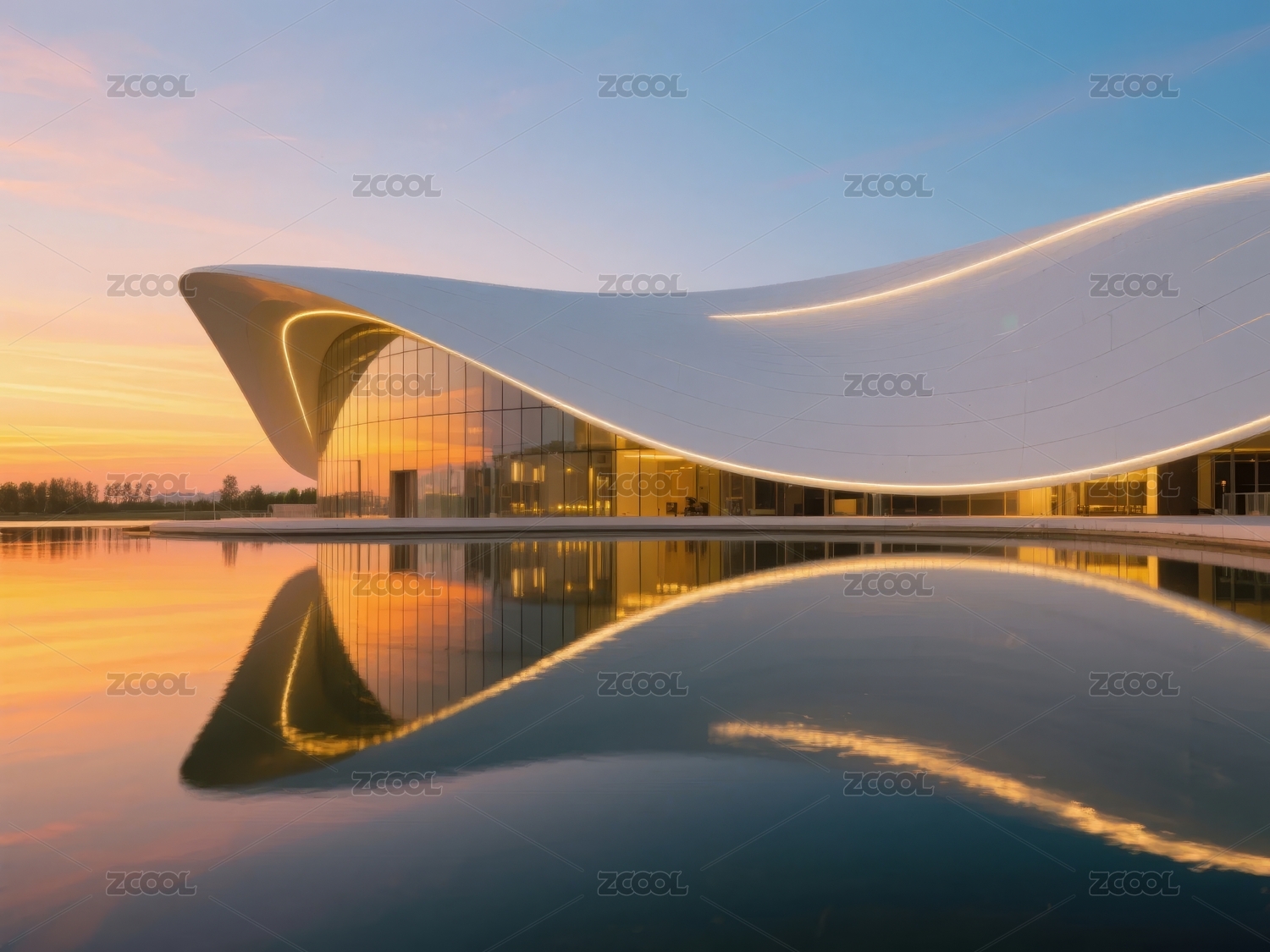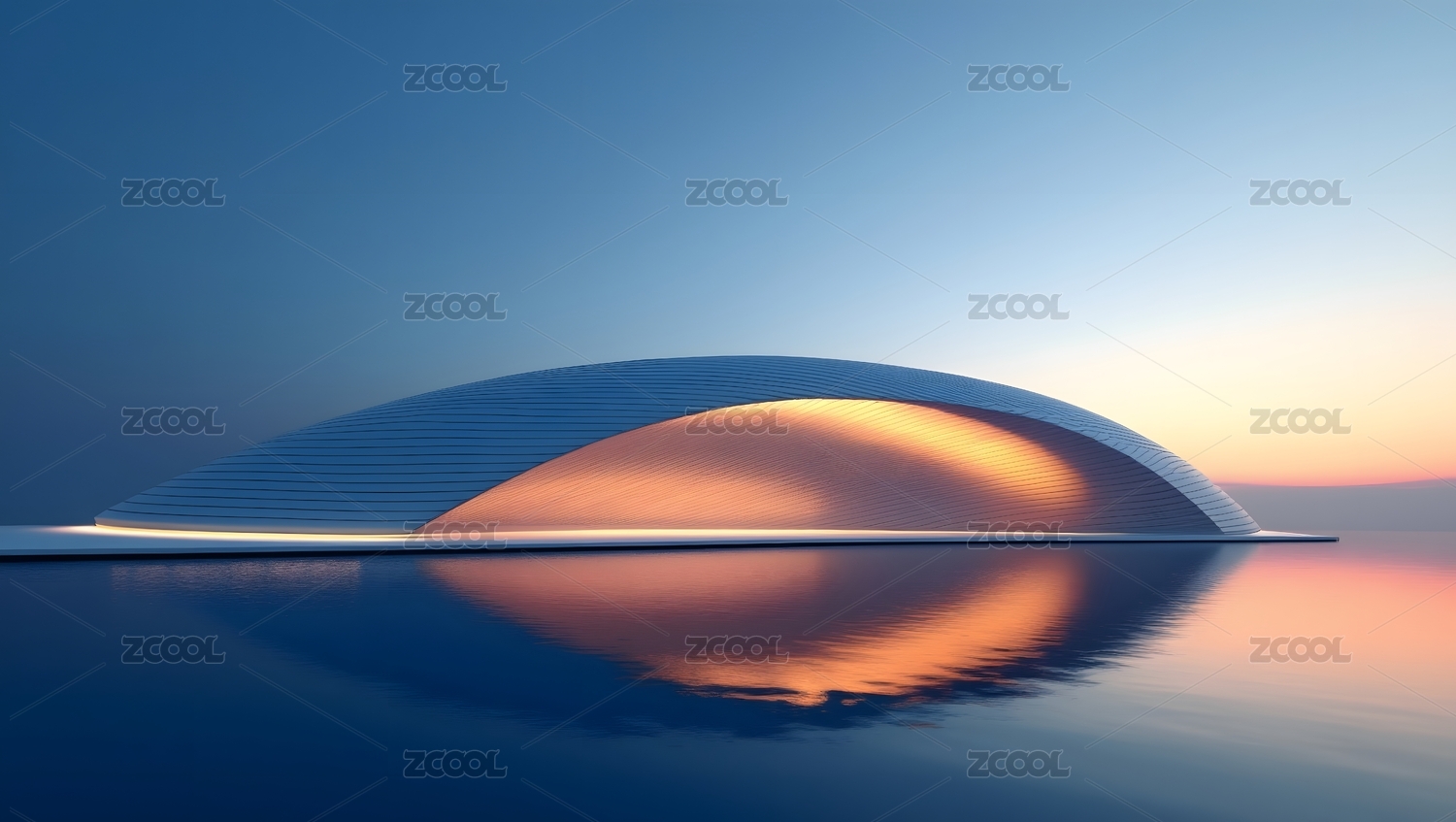 波浪形现代建筑与宁静水面