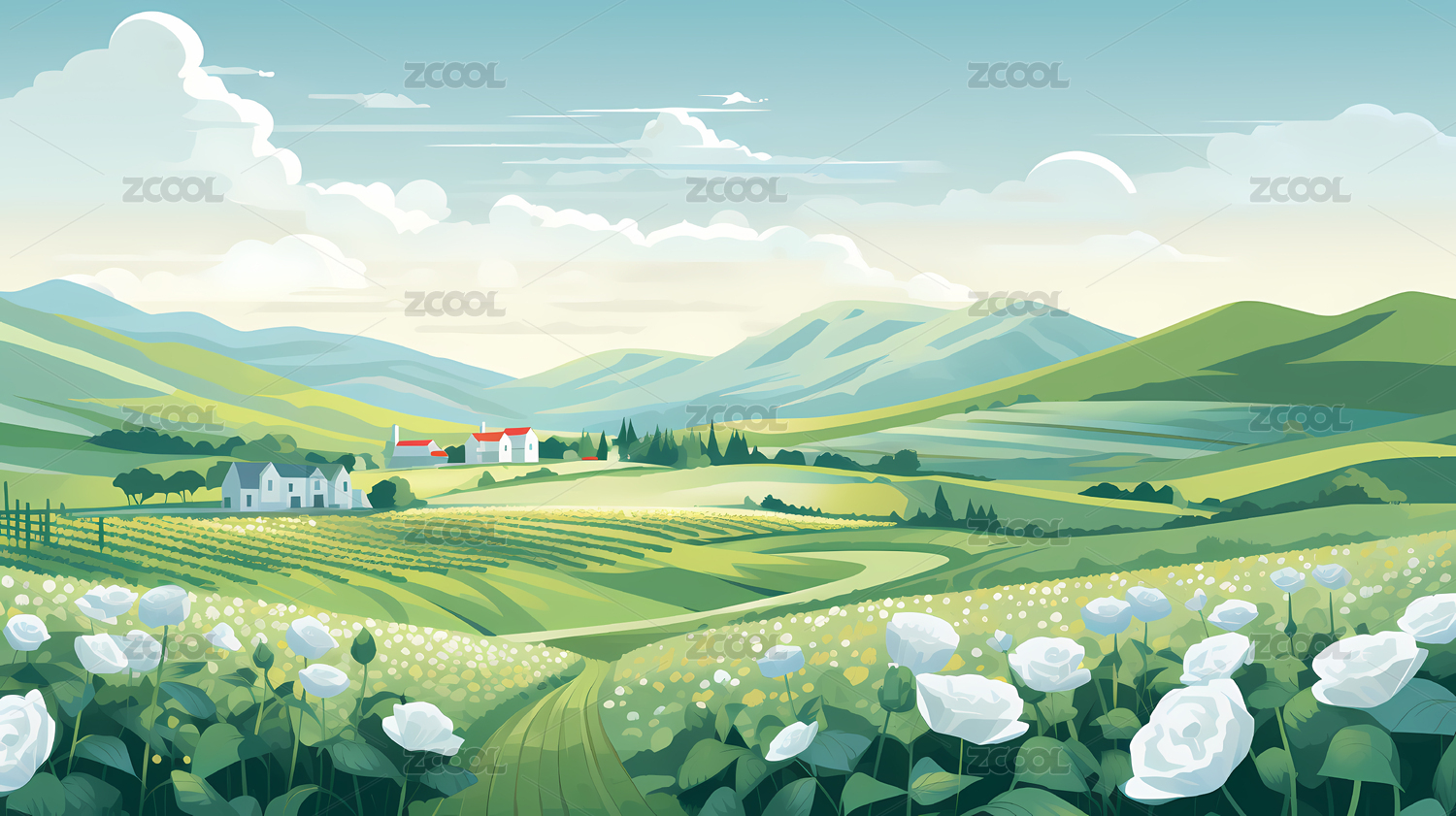 自然户外绿色乡村田野插画背景壁纸