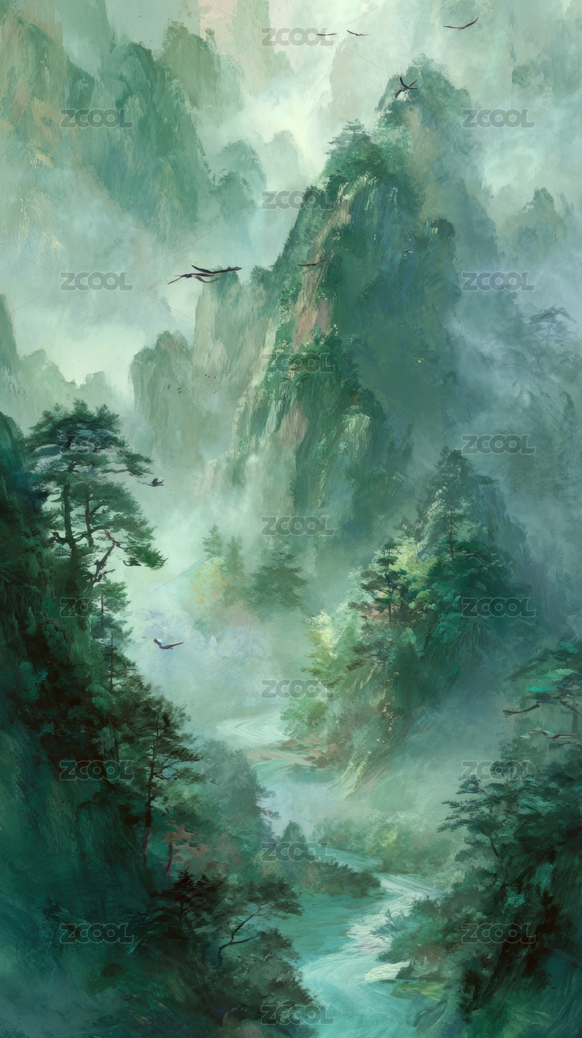 河流,灰色调,蓝色,细腻笔触,传统元素,高分辨率,中国山水画,深青色,雾气弥漫,挂灯笼