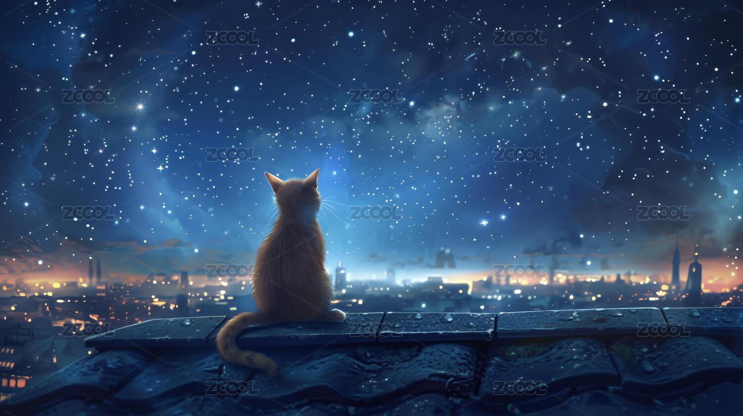 红猫,阳台,星空,城市灯光,梦想,飞向太空,不真实引擎,电影场景,宁静,幻想