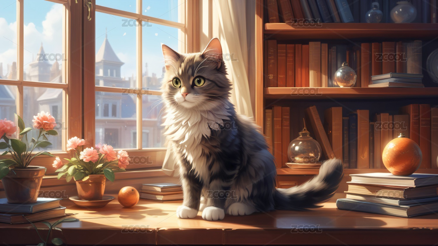 小猫,书籍,皮克斯风格,高分辨率,特写镜头,电影灯光,温暖色调,图书馆,迪士尼动画,细节表现