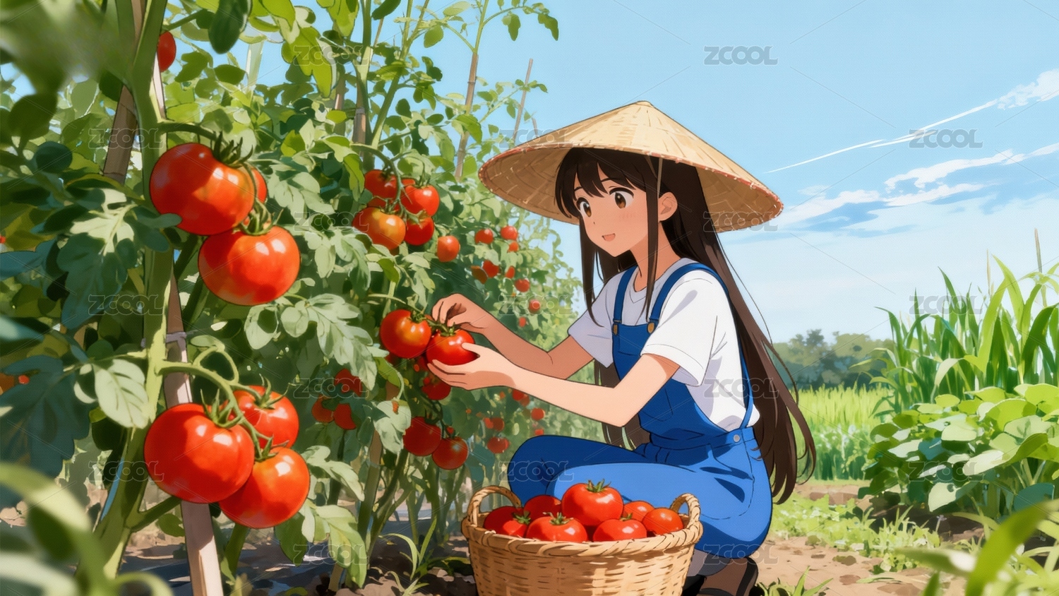 生态植物园里面拿着红色番茄的小女孩横屏壁